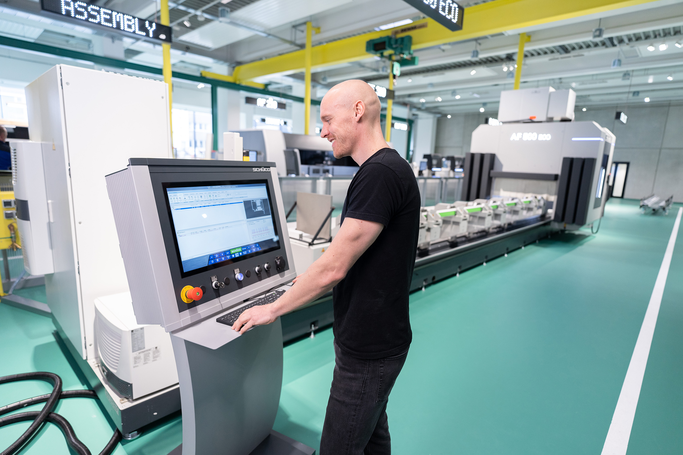 Die Fünf-Achsen-CNC-Maschine Schüco AF 500 ECO vereint die Produktionsschritte Zuschnitt und Bearbeitung mit einem innovativen ökologischen Konzept.