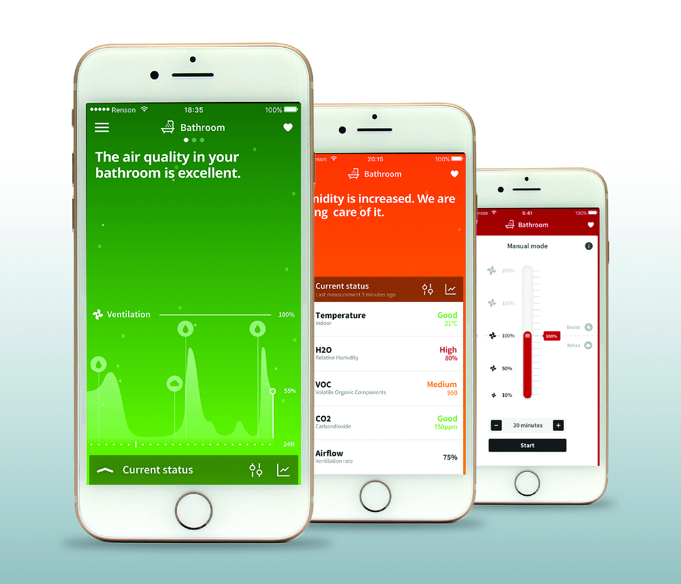 Bis zu drei Schüco VentoFlow Ablüfter können in das WiFi-Heimnetzwerk eingebunden werden. Dabei ist die App zur Steuerung des VentoFlow für Android und iOS verfügbar und visualisiert übersichtlich Raumluftqualität und Komfortparameter.