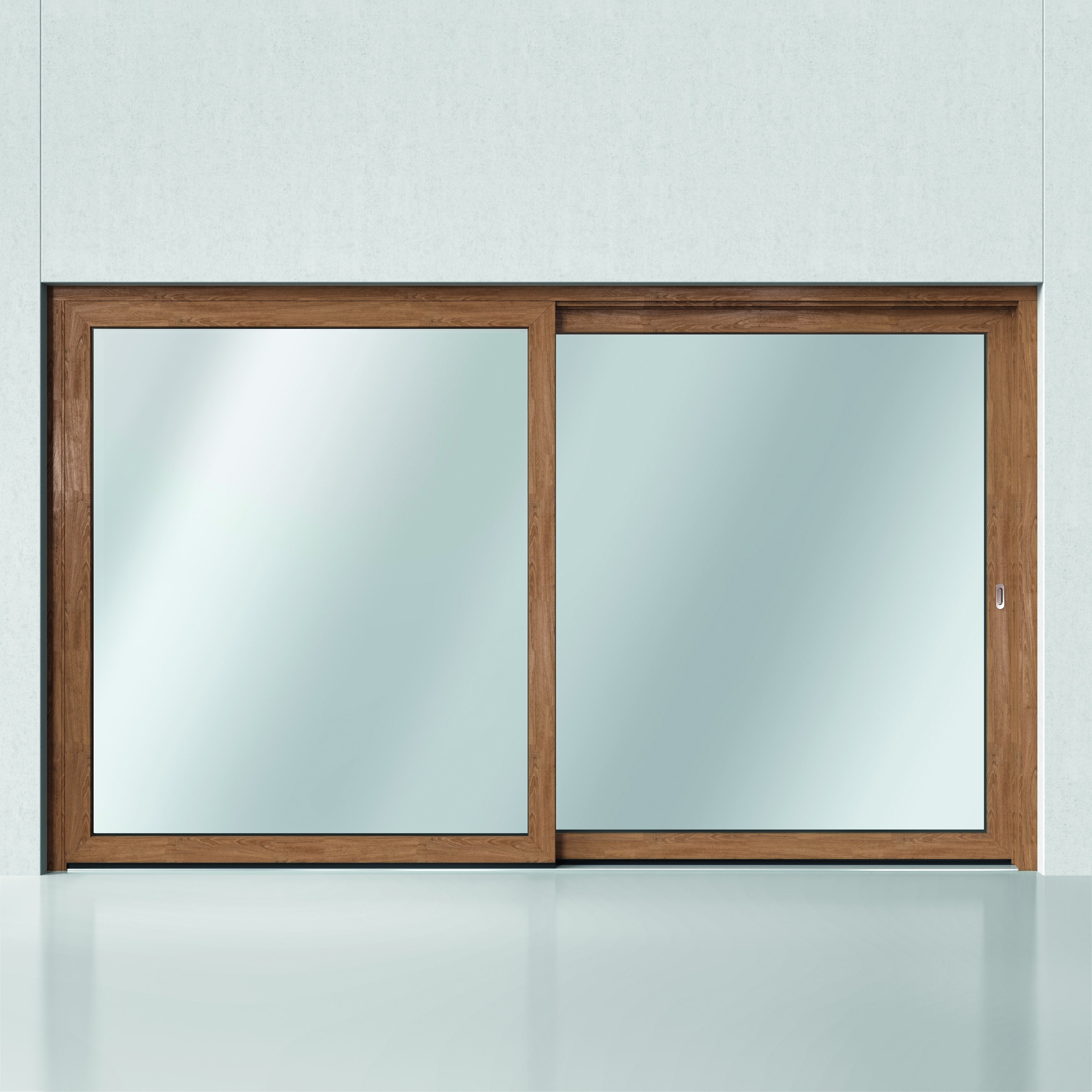 Die Schüco EasySlide – New Generation kann mit zwei bis vier Flügeln ausgeführt werden und überzeugt dank der Schüco UnlimitedFinish Farbauswahl – hier mit Holzmaserung – auch optisch.