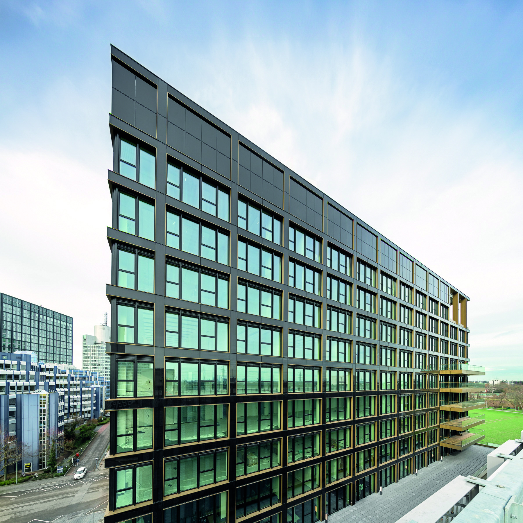 Bielefeld. Mit dem Bürohochhaus „Matchbox“ in Eschborn hat der Frankfurter Projektentwickler Lang & Cie. Real Estate AG einen hochwertigen Büroneubau geschaffen, der auf zehn Ebenen flexible Arbeitsflächen zur Verfügung stellt. Die Planung erfolgte durch das Frankfurter Architekturbüro Dietz Joppien Hammerschmidt GmbH. Eine Besonderheit des Entwurfs ist die elegant detaillierte Glasfassade mit dem bauwerkintegrierten Photovoltaiksystem (BIPV) von Schüco. Die eingesetzten Photovoltaik-Module liefern eine Strommenge von jährlich etwa 180.000 kWh und tragen entscheidend zu einem energieeffizienten Gebäudebetrieb bei. Mit dem Projekt belegt der Fassadenspezialist aus Bielefeld seinen Anspruch auf eine Dekarbonisierung über den gesamten Gebäudezyklus hinweg, vom Entwurf über die Ausführung und den Gebäudebetrieb bis hin zum Recycling.