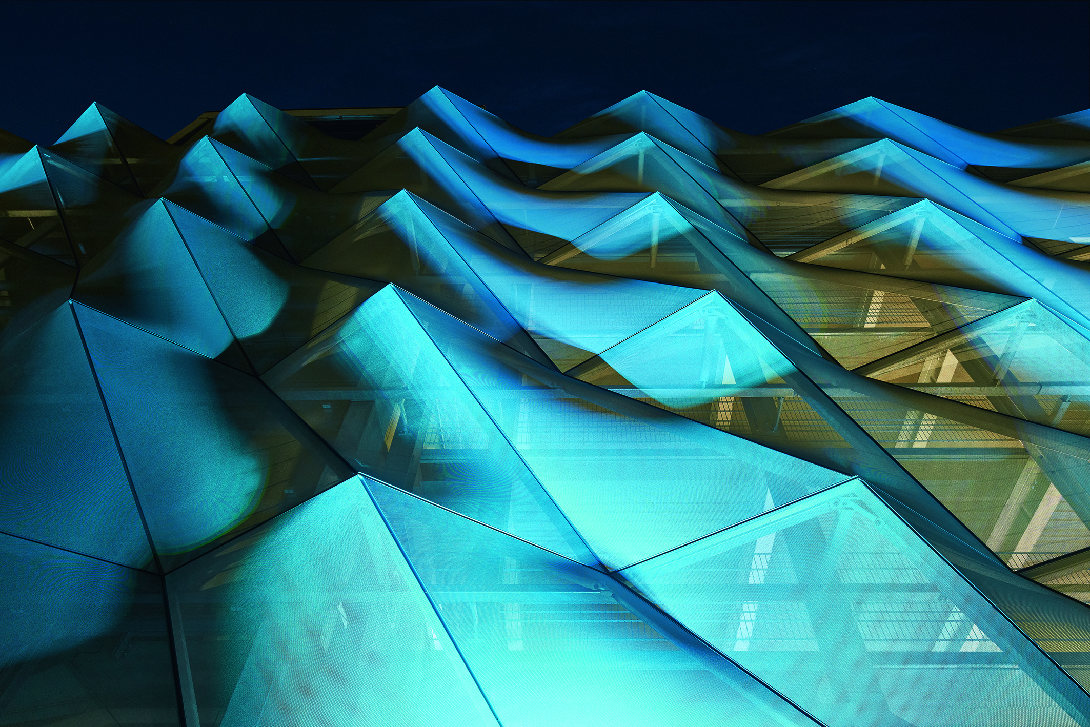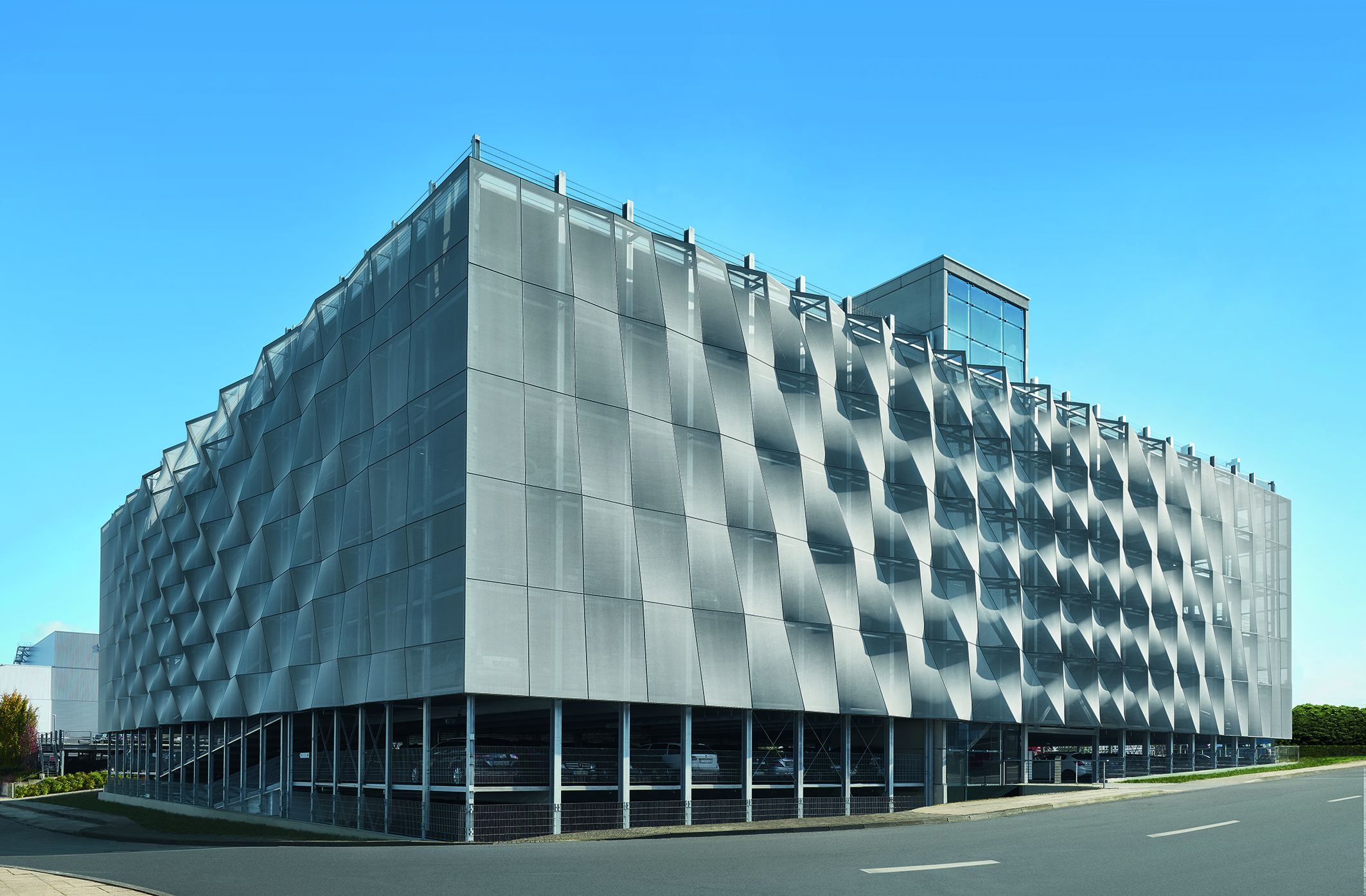 Die große Besonderheit der FACID-Fassade beim Schüco Parkhaus liegt in der Umsetzung des 3D-Effektes. Die individuelle Verdrehung der Teilflächen erzeugt zwei- und dreidimensional formbare Flächen.