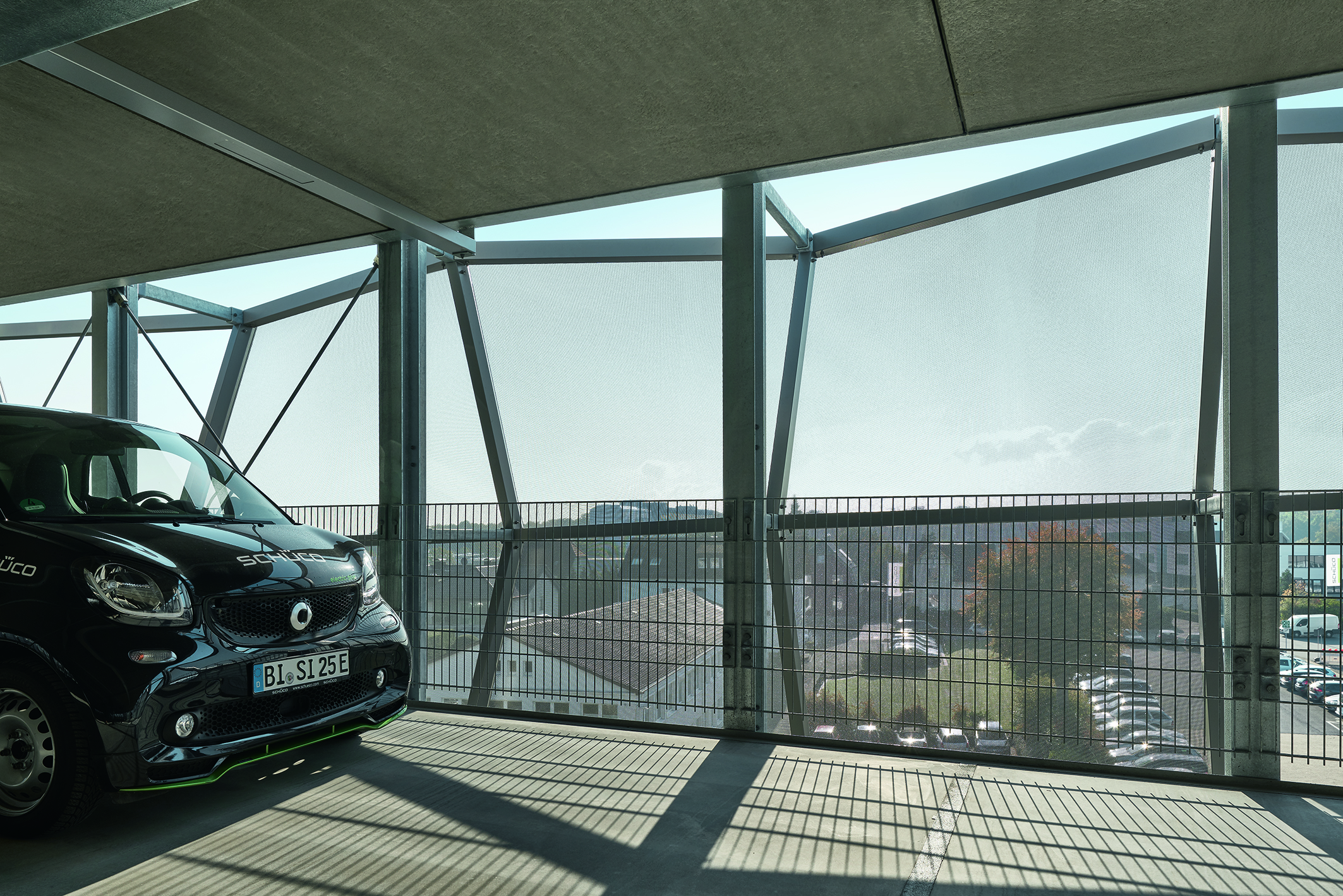 Bei Tag zeigen sich die Parkdecks hell und lichtdurchflutet, das transparente Gewebe ermöglicht gute Belüftung bei einer uneingeschränkten Durchsicht von innen nach außen.
