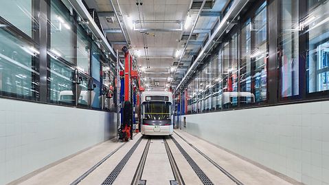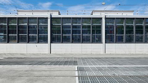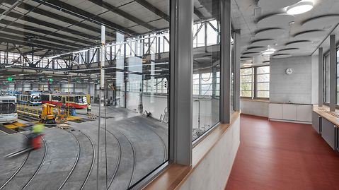 Um zukünftig alle Tramfahrzeuge unabhängig vom Außenklima reinigen zu können, wurde die offene Außenwaschanlage im Rahmen der Sanierung eingehaust. Dabei kam das Aluminium-Fenstersystem Schüco AWS 65 zur Anwendung. Das System ist Cradle-to-Cradle-zertifiziert und besitzt darüber hinaus Vorzüge wie gute Wärmedämmung, schlanke Ansichtsbreiten und verdeckt liegende Beschläge.