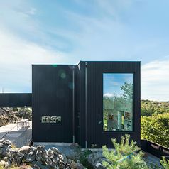 Die Gebäudehülle besteht aus dunkel gestrichenem Holz, das, vom Meer her betrachtet, optisch mit dem Berg im Hintergrund verschmilzt. Nähert man sich dem Haus – hierfür muss man von Westen kommend die Sichtbetonstufen erklimmen –, ändert sich jedoch das Bild: Das Gebäude steht sichtbar auf einer Anhöhe und wirkt selbst wie ein großer Fels. Komponiert ist es aus zwei parallelen und leicht zueinander versetzten Baukörpern mit Schrägen und scharfen Kanten. In den Abendstunden leuchtet das bewohnte Haus; durch die verschiedenen großen und kleinen Fenster kann man ungehindert in das Leben der Familie blicken. Die Architekten schreiben, das Gebäude sei von innen entworfen worden. Die Fassadenöffnungen sind entsprechend der räumlichen Nutzung und dem Bezug zur Landschaft positioniert. Beeindruckend ist der Blick durch das Panoramafenster (Schüco FW 50+), das die Hauptseite gen Wasser prägt. Durch die Öffnung hat der 12 m2 große und zum Teil 5,5 Meter hohe Wohn und Essbereich konstantes, angenehmes Tageslicht. Der Luftraum und die Fenster lassen den Raum insgesamt größer als in Wirklichkeit erscheinen. Die Küchenzeile, wie alle inneren Raumabschlüsse aus hellem Holz gefertigt, orientierten die Architekten nach Norden. Ein nahezu raumhohes und breites Fenster gewährt auch hier freie Sicht. Im rückwärtigen Bereich des Wohngeschosses befinden sich zwei Schlafräume und das gemeinsam genutzte Bad. Die Türen sind geschickt in der Holzwand bzw. zwischen den Einbauschränken versteckt. Ein Durchgang führt zur rückwärtigen und in den Hang gebauten Terrasse. Eine einläufige, in die Holzstruktur integrierte Treppe erschließt die offene Galerieebene, an der wiederum zwei Schlafzimmer angelagert sind. Die beiden flügelförmigen Dachterrassen richteten die Planer jeweils nach Osten und Westen aus. Wenn das Wetter es zulässt, findet die Familie auch hier Platz zum Essen, Spielen und Leben.