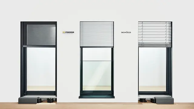 Schüco bietet verschiedene Blend- und Sonnenschutzlösungen für Fenster und Schiebetüren. Für Schüco Perfect stehen drei unterschiedliche Sonnenschutzvarianten zur Verfügung: ein Raffstore (für gezielte Lichtlenkung und komplette Verdunkelung), ein Rollladen und ein textiler Sonnenschutz Zip Design Screen (für hohe Leistungsfähigkeit, Witterungs- und Windstabilität).