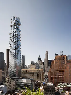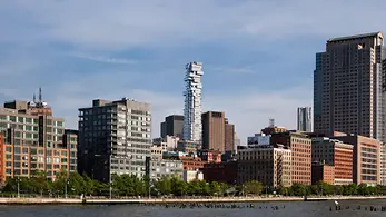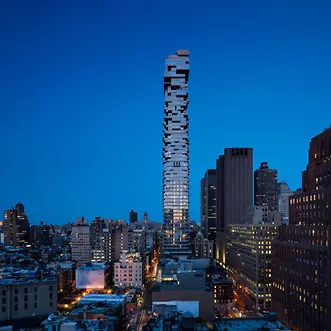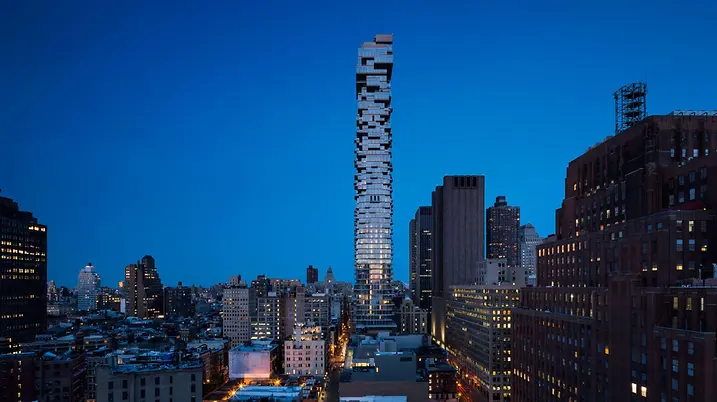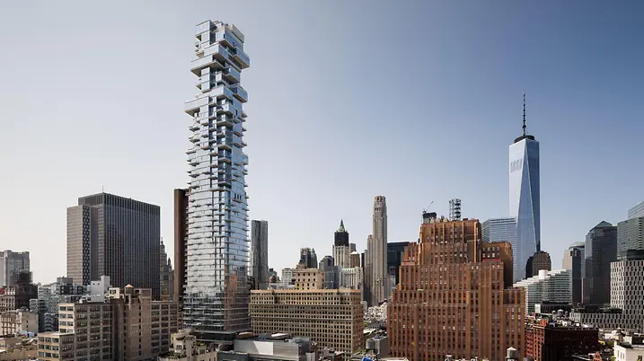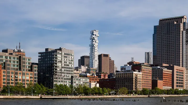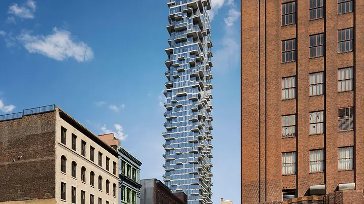 Im historischen Tribeca District in New York sind eigentlich nur sechs Geschosse üblich. Umso mehr fällt in diesem Umfeld der 253 Meter hohe Wohnhochhausturm 56 Leonard Street ins Auge: Auf einer Grundfläche von 30 x 38 Metern stapeln sich 57 Stockwerke mit 146 Wohnungen und Gemeinschaftsflächen.
