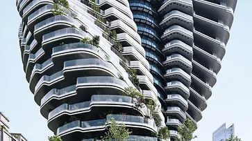 Auffällig sind die großen Balkone, die aufgrund der Doppelhelix-Bauweise zum Teil unter freiem Himmel liegen (jede Etage ist um 4,5° gedreht, das Gebäude in sich um insgesamt um 90°). Hier können die über 20.000 gepflanzten Bäume und Büsche wachsen und gedeihen. Die Begrünung sorgt nicht nur für eine beeindruckende Optik, sondern trägt auch zur Verbesserung der Luftqualität bei und reguliert die Temperatur im Inneren des Gebäudes.