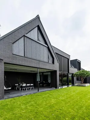 Im Außen- wie im Innenraum spiegelt sich die Lieblingsfarbe der Bauherren in allen Materialien wider: Die schwarzen Aluminium-Scharen des Daches finden sich in den Gauben und Fassadenelementen wieder und bilden eine Einheit mit dem schwarz nuancierten Klinkermauerwerk. Die extraschmalen Profile der Aluminium-Fenster von Schüco sind, genauso wie die Pfosten-Riegel-Fassade und die Klassik Design Schiebetüren, ebenfalls in Schwarz gehalten. Von den Architekten auf Maß gefertigte schwarze Einbaumöbel und Bäder runden das Farbkonzept ab.