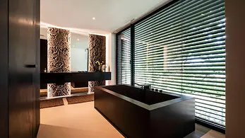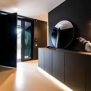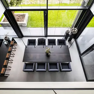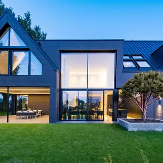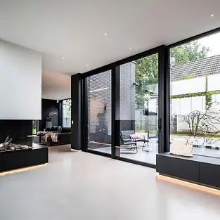 Obwohl Schwarz unweigerlich den Ton in diesem Objekt angibt, holen die offene Architektur, die nahezu transparente Nordfassade und die großzügige Belichtung auf der Südseite ein Maximum an Licht ins Haus. Möglich macht das die Kombination aus Schüco Hebeschiebeanlagen und einer Pfosten-Riegel-Konstruktion, die das Erdgeschoss mit dem Obergeschoss verbindet. Die großflächigen Verglasungen folgen der Blickachse über offene Räume, sodass bereits beim Betreten des Hauses der Blick über das Wohnzimmer hinaus ins Grüne fällt. Weiterhin tragen hochwärmegedämmte und Cradle-to-Cradle-zertifizierte Fenster, Fassaden und Schiebetüren von Schüco zu einer energieeffizienten und nachhaltigen Gebäudehülle bei.