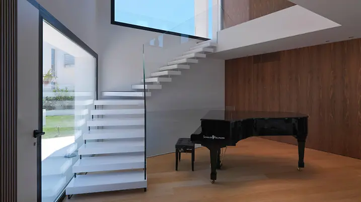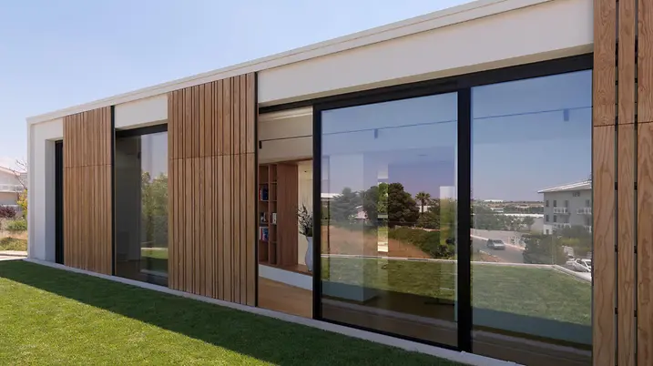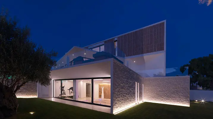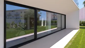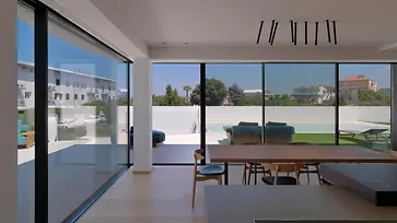 Das elegante Wohnhaus Casa Puntara lässt Innen- und Außenbereich verschmelzen: Die großen, bodengleichen Panorama Design Schiebetüren geben den Blick auf Pool, Palmen, Oliven- und Johannisbrotbäume frei. Ein Highlight ist die Glaslösung über Eck ohne Pfosten, die den Kochbereich nahtlos mit dem Garten verbindet.