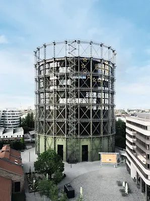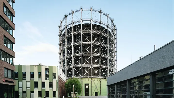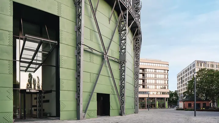 Der Gasometer in Berlin-Schöneberg, einst Symbol des Industriezeitalters, wurde durch eine umfassende Sanierung in ein Büro- und Veranstaltungszentrum transformiert. Dafür integrierte man einen Büroturm mit 28.000 m² Nutzfläche in das denkmalgeschützte Stahlgerüst. Als Teil des EUREF-Campus ist das Gasometer heute ein Ort für Digitalisierung, Energieinnovation und internationale Begegnungen mit beeindruckendem Panoramablick über Berlin.