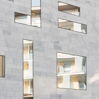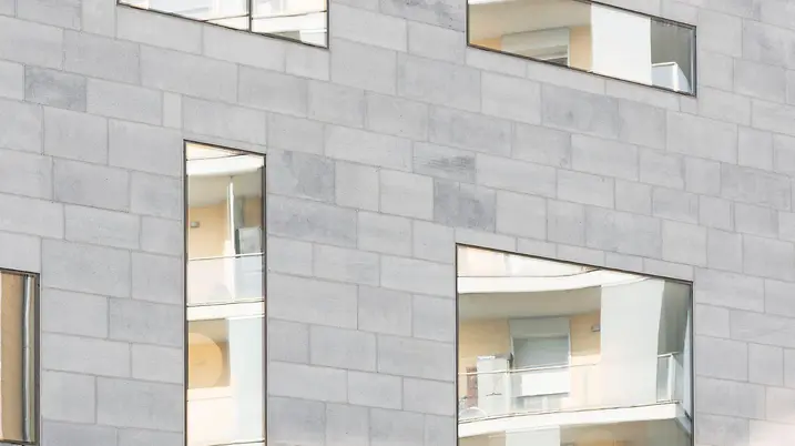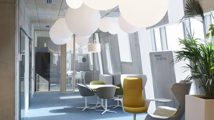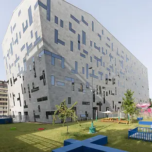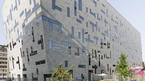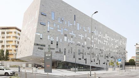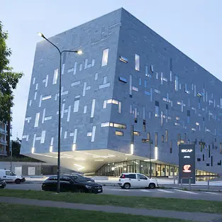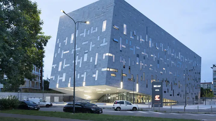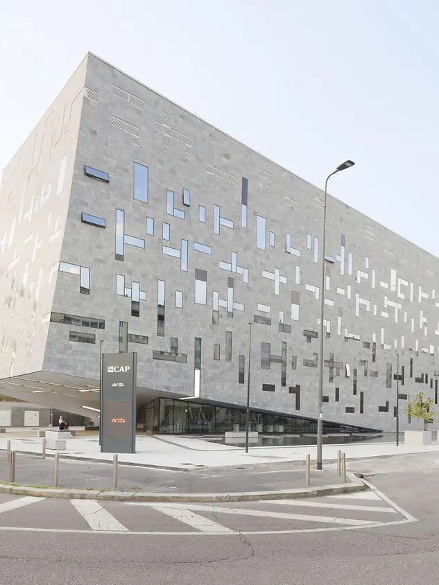Das Headquarter der CAP-Gruppe in Mailand erinnert an eine schwimmende Arche. Das markanteste Element ist ein großer Überhang, der dem monolithischen Gebäude Leichtigkeit verleiht und zugleich seinen Eingang hervorhebt.