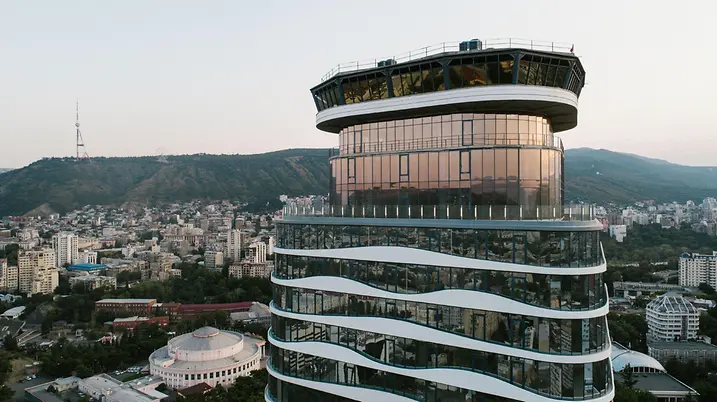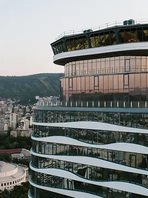Tiflis, die georgische Hauptstadt, liegt an der Grenze zwischen Europa und Asien in Transkaukasien. Neben orthodoxen Bauten, prächtigen Gebäuden im Art-nouveau-Stil und modernistischen Gebäuden aus sowjetischer Zeit prägen auch zahlreiche Hochhäuser das Stadtbild. Besonders auffällig aufgrund seiner Höhe und Erscheinung ist der King David Tower. Das Tragwerk besteht aus einem monolithischen Stahlbetonrahmen mit starren Knoten und Kernen in der Mitte des Gebäudes, um den auftretenden Windlasten und der erforderlichen Erdbebensicherheit gerecht zu werden. Vom Boden bis zur Decke reichende Verglasungen fangen das atemberaubende Panorama ein, das sich bis zu den schneebedeckten Gipfeln des Kaukasus erstreckt.