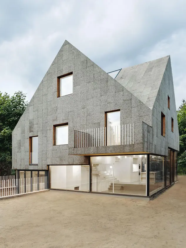 Kork gehört zu den Materialien, die man bei einem Haus eher im Innenraum vermutet – in erster Linie auf dem Boden. Umso überraschender sind Korkfassade und Korkdach des so genannten „Korkenzieherhauses“ in Berlin-Staaken. Im optischen Kontrast dazu – und um einen Bezug zu den regionalen Bauten herzustellen – verkleidet eine Vorsatzschale aus Stampfbeton den Rohbau im Untergeschoss. Der Werkstoff besitzt eine offenporige, strukturierte Oberfläche, die den Gebäudesockel wie ausgegraben wirken lässt.