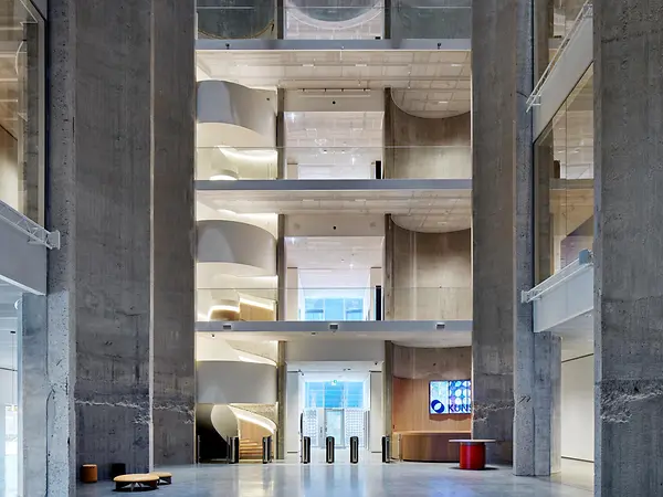 Die Gestaltung des Kunstsilos ist ein Paradebeispiel für adaptive Wiederverwendung. Anstatt die industrielle Ästhetik des Silos zu verbergen, wurde sie durch moderne Eingriffe hervorgehoben: Die Architekten entschieden sich beispielsweise, eine perforierte Aluminiumhaut über die ursprüngliche Betonstruktur zu legen, die nicht nur die Form des alten Gebäudes neu interpretiert, sondern auch das Tageslicht auf interessante Weise in die Innenräume lenkt.