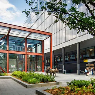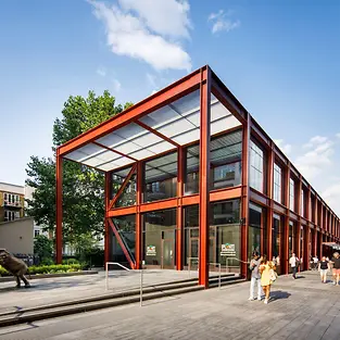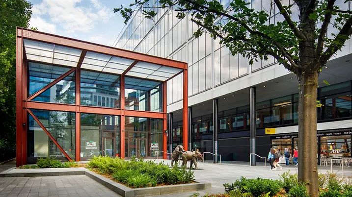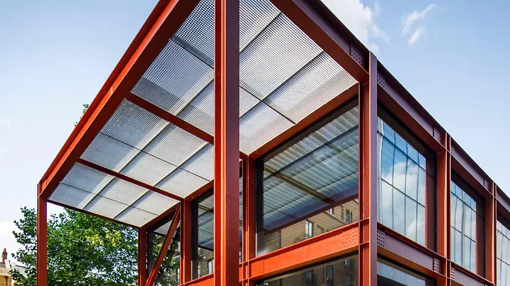Eine oxidrote Stahlkonstruktion verleiht dem Lamb Street Building sein unverwechselbares Aussehen. Um diesen ausgeprägten industriellen Charakter zu betonen, wurde die thermische Gebäudehülle hinter der Stahlkonstruktion angeordnet. Für die Herstellung der raumabschließenden Vorhangfassaden kamen sowohl ein Aluminiumsystem als auch das Stahlfassadensystem Schüco VISS SG zum Einsatz.