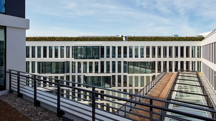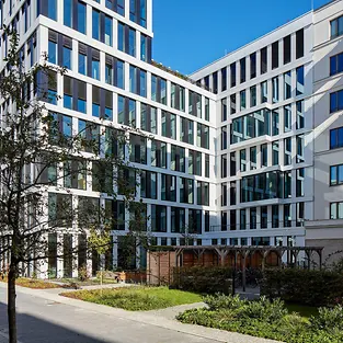 Das Herzstück des 7-geschossigen Bürogebäudes bildet das begrünte Atrium. Die Großzügigkeit des Raums, der Lichteinfall, die gewählten Materialien (z. B. schnell nachwachsender Bambus für die Freitreppe) und die Bepflanzung sorgen für ein natürliches Raumklima und eine angenehme Verweilatmosphäre. Das Erdgeschoss rund um das Atrium ist öffentlich zugänglich und bietet sich für Gastronomie und Publikumsverkehr an. Im Kellergeschoss befindet sich die Tiefgarage mit Platz für 64 Fahrzeuge, Ladestationen für Elektroautos sowie Abstellmöglichkeiten für rund 120 Fahrräder.