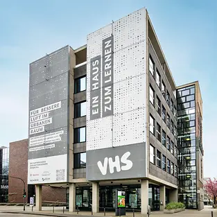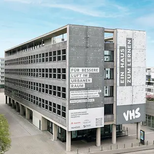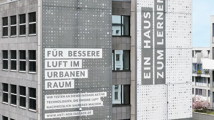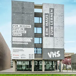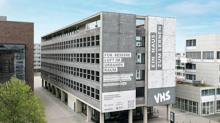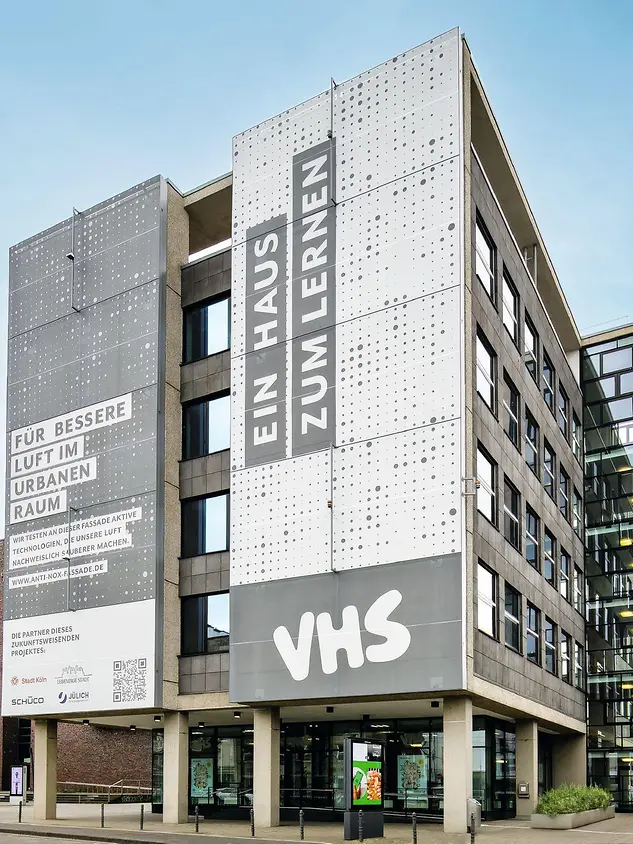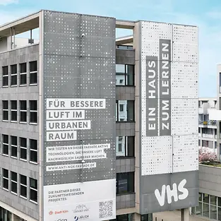 An der Volkshochschule in der Kölner Cäcilienstraße wurde im Rahmen eines Forschungsprojekts der Stadt Köln, der Stiftung „Lebendige Stadt“ und von Schüco eine photokatalytische Textilfassade installiert. Messungen zeigen: Sie reduziert die Stickoxidbelastung der Luft um rund 30 Prozent. Das Projekt soll Vorbild für andere Städte sein.