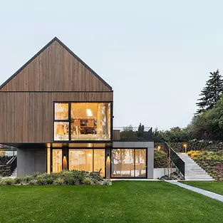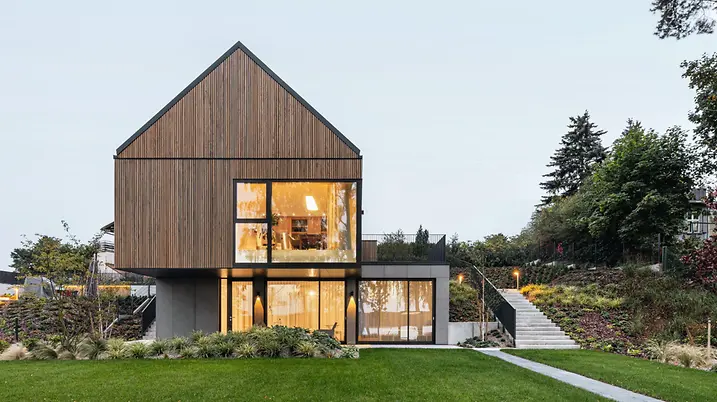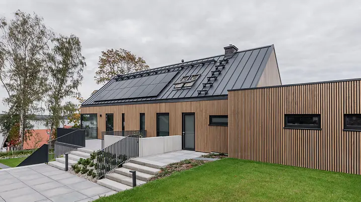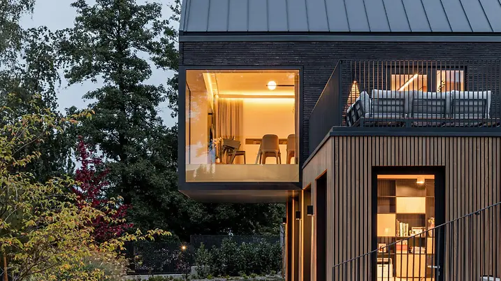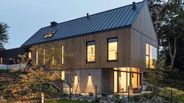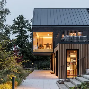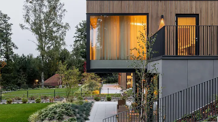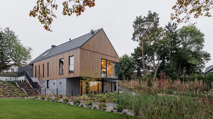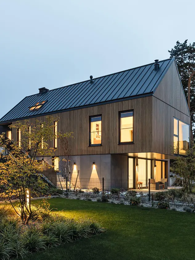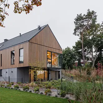 Der Entwurf eines Ensembles aus zwei Einfamilienhäusern in der Tucheler Heide (Polen) reagiert sensibel auf ein herausforderndes Grundstück mit südlicher Zufahrt und deutlicher Hanglage. Die Gebäude greifen die Topografie auf und übersetzen sie in eine klare architektonische Haltung.