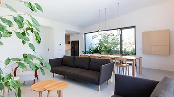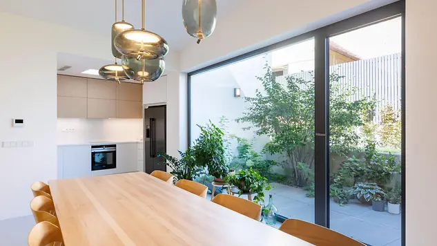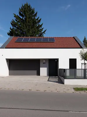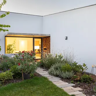 Zurückhaltend fügt sich das Einfamilienhaus in seine Umgebung – ein ruhiges Wohngebiet im tschechischen Tišnov. Von der Straße aus kaum einsehbar, reagiert der Baukörper auf die Form des schmalen, tief orientierten Grundstücks sowie auf den Charakter der umliegenden Bebauung.