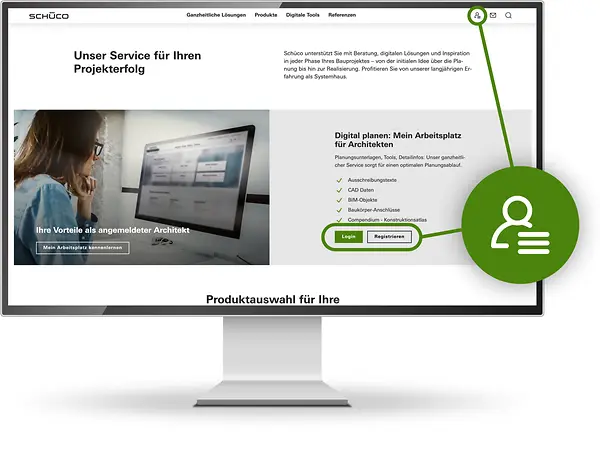 Der direkte Einstieg in Ihre persönliche Arbeitswelt, wie Ausschreibungstexte, CAD-Daten, BIM-Objekte, Baukörperanschlüsse und das Schüco Compendium ist nun über die Startseite möglich. Zusätzlich können Sie auch über das Icon auf der rechten Seite in „Mein Arbeitsplatz" gelangen.
