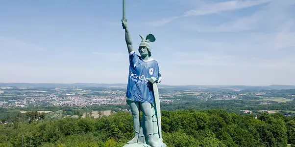 Als Hauptsponsor des DSC Arminia Bielefeld, haben wir dem Hermannsdenkmal ein Arminia-Trikot angezogen. Was nach dem Pokalhalbfinale als KI-generiertes Bild viral ging, ist jetzt Realität. Mit der Aktion möchte Schüco das Erreichen des Pokalfinales und seine 50-jährige Partnerschaft mit Arminia Bielefeld feiern.