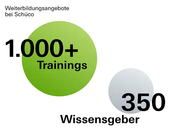 Schüco bietet individuelle Karrierepfade für angehende Führungskräfte und Fachspezialisten. Dafür steht ein breites Spektrum an Weiterbildungsangeboten zur Verfügung – von Präsenzveranstaltungen über Online-Trainings bis hin zu E-Learnings. Diese decken sowohl fachliche als auch persönliche Entwicklungsthemen ab, darunter Führung, digitale Kompetenzen sowie Team- und Projektmanagement. Zusätzlich nutzen wir Schulungen, um unsere Mitarbeitenden für Nachhaltigkeitsthemen zu sensibilisieren.