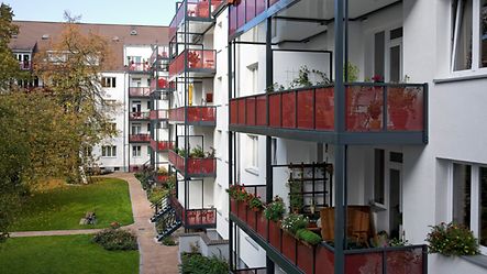 Die Schüco Stapelbalkone zeichnen sich durch einen hohen Vorfertigungsgrad aus. Dadurch ist der Aufbau zeitsparend und wirtschaftlich. Innenliegende Stützen sorgen dafür, dass sich die Balkone harmonisch in das Gesamtbild der Fassade einfügen.