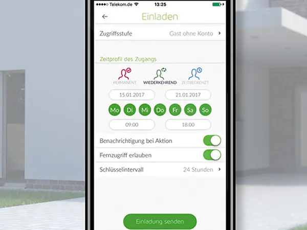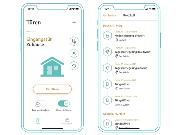 Bequemes Öffnen und einfaches Bedienen der Tür – dafür sind weder eine Schulung noch eine komplizierte Weblösung zur Vergabe von Benutzerrechten erforderlich. Mit der App lässt sich die Tür komplett schlüssellos öffnen. Zugangsberechtigungen für weitere Nutzer können durch einfaches Hinzufügen eines Fingerprints erteilt werden. Praktisch: Im Auslieferungszustand kann die Tür auch ohne Zutrittsberechtigung mit der App geöffnet werden.