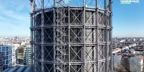 Der Gasometer in Berlin-Schöneberg, einst Symbol des Industriezeitalters, wurde durch eine umfassende Sanierung in ein Büro- und Veranstaltungszentrum transformiert. Dafür integrierte man einen Büroturm mit 35.000m² Nutzfläche in das denkmalgeschützte Stahlgerüst. Ein hoher Vorfertigungsgrad sicherte dabei Präzision und eine effiziente Montage.