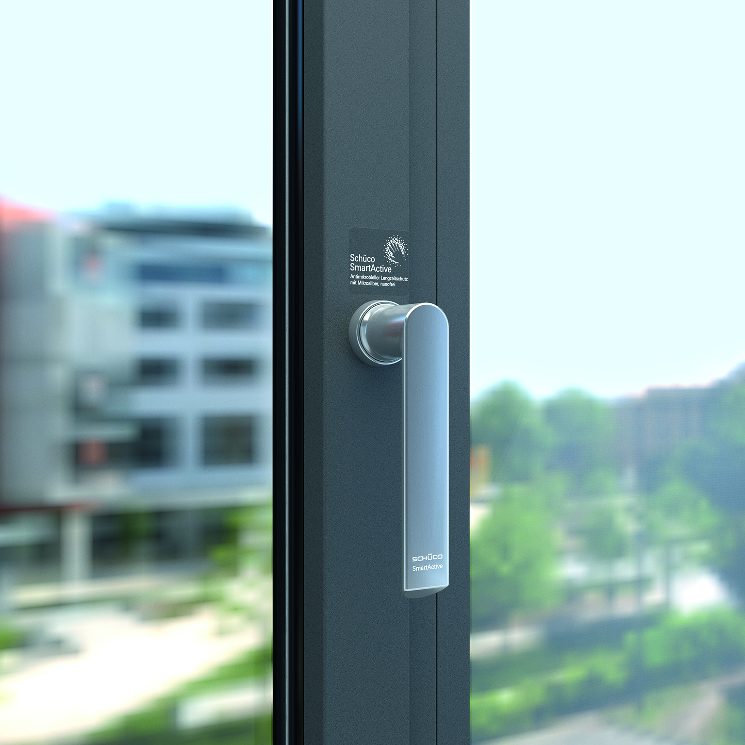 Das Schüco After Sales Service Team berät auch zu Nachrüstprodukten, wie dem antibakteriellen Fenstergriff Schüco SmartActive, um einen nachhaltigen Werterhalt und eine Steigerung von Energieeffizienz, Sicherheit und Komfort zu ermöglichen.