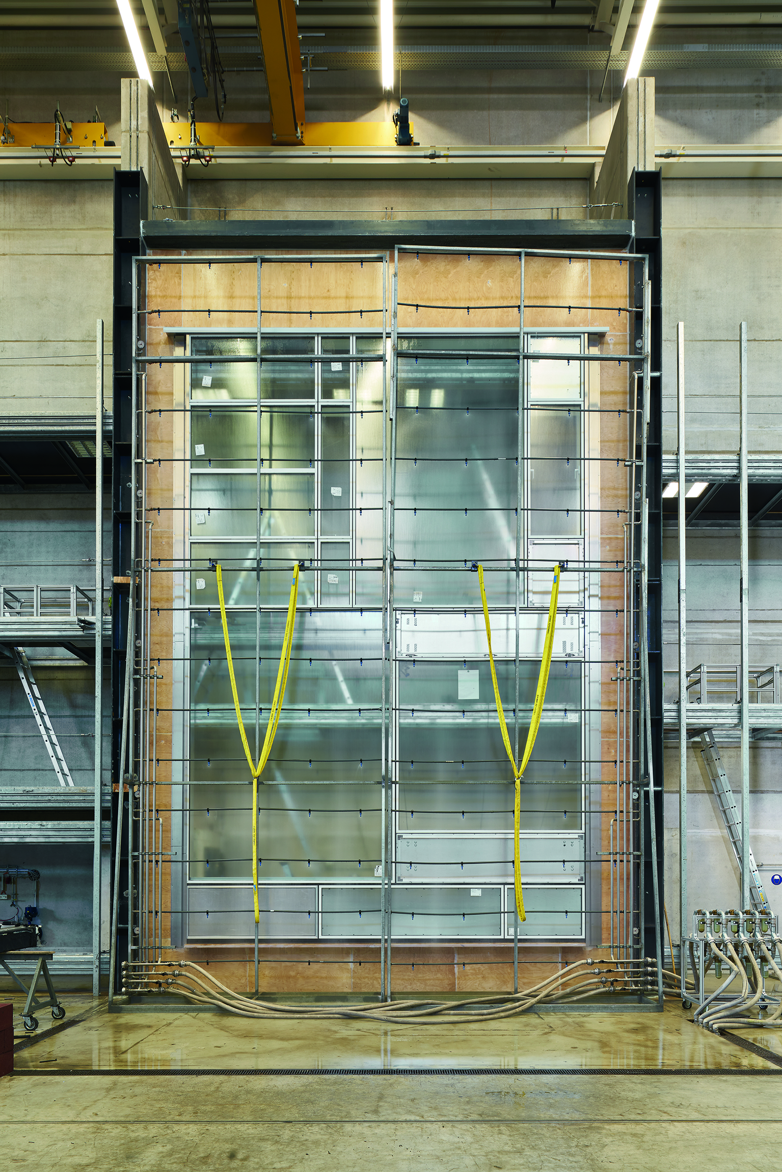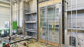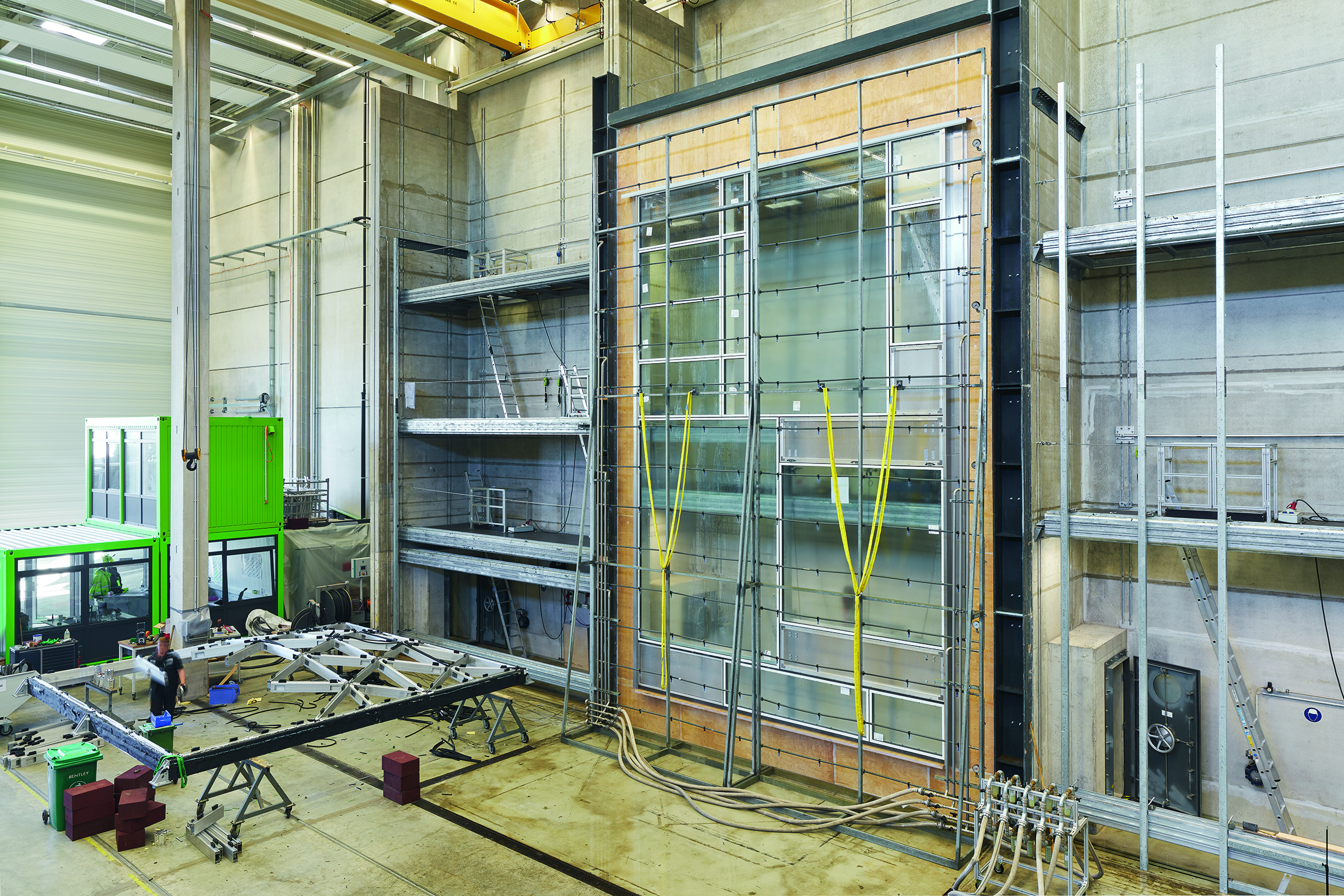 Die Elementfassade Schüco AF UDC 80 wird im Schüco Technologiezentrum mit einer Breite von 5,7 m und einer Höhe von 8,8 m getestet.