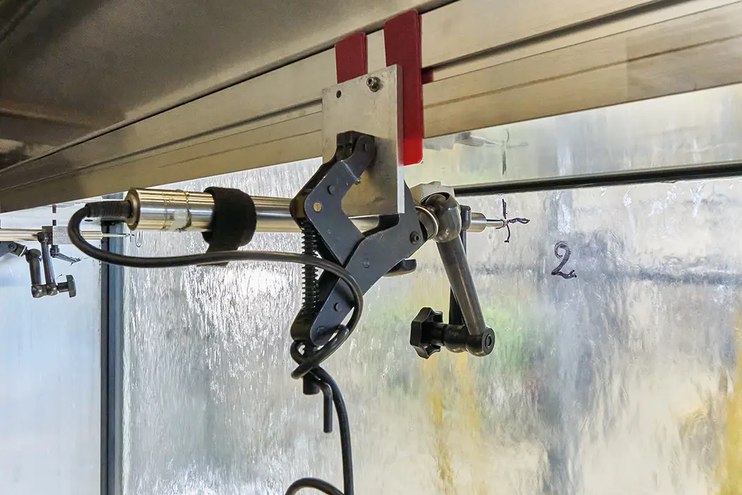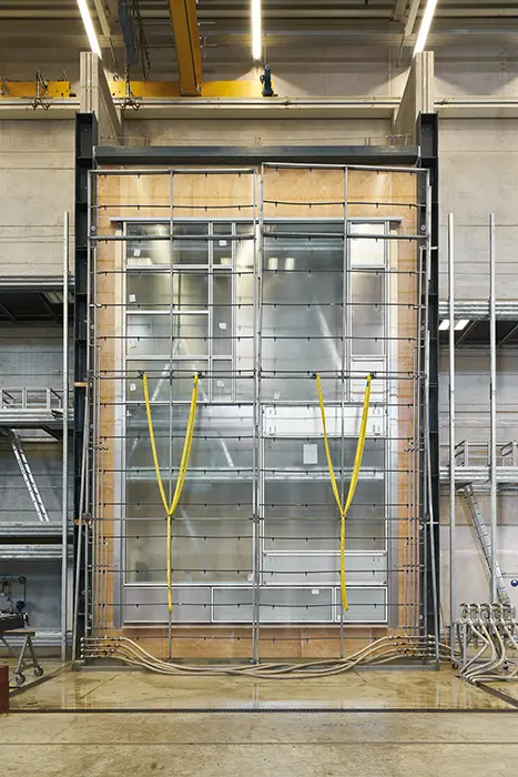 Bei der Windwiderstandsprüfung ermittelt ein Wegaufnehmer das Ausmaß, in dem sich die Fassade bei der Prüfung verformt. Der Prüfkörper hält dabei einem wechselnden Über- und Unterdruck von 2500 Pa stand mit einer Sicherheitslast von 3750 Pa.