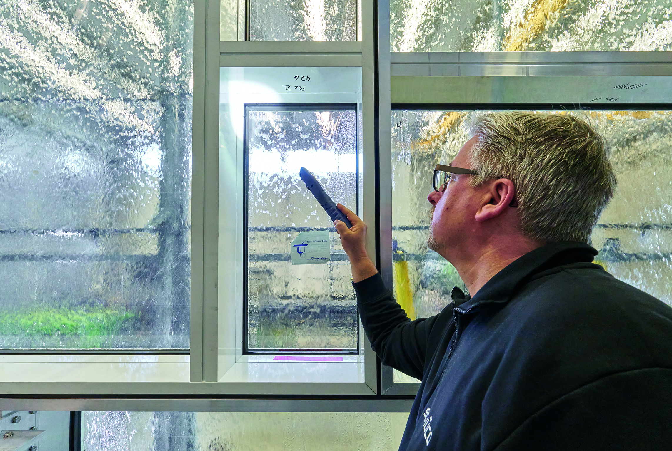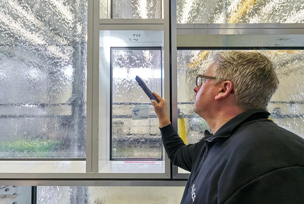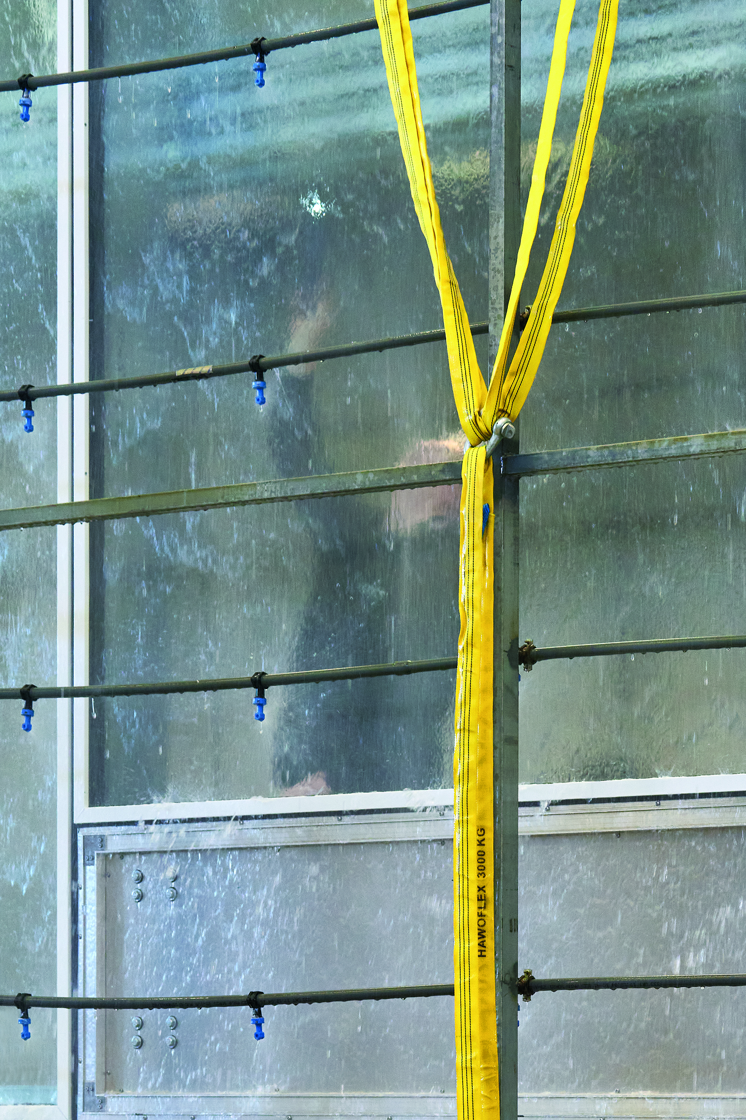 Die Schlagregendichtheit der Elementfassade wird mithilfe einer Besprühungsanlage geprüft, die entsprechend eines kräftigen Gewitterregens 3,4 l/min m2 auf die Fassade gibt. Dabei wird die höchste Klasse RE bei der Prüfung auf statischen Schlagregendichtheit erreicht.