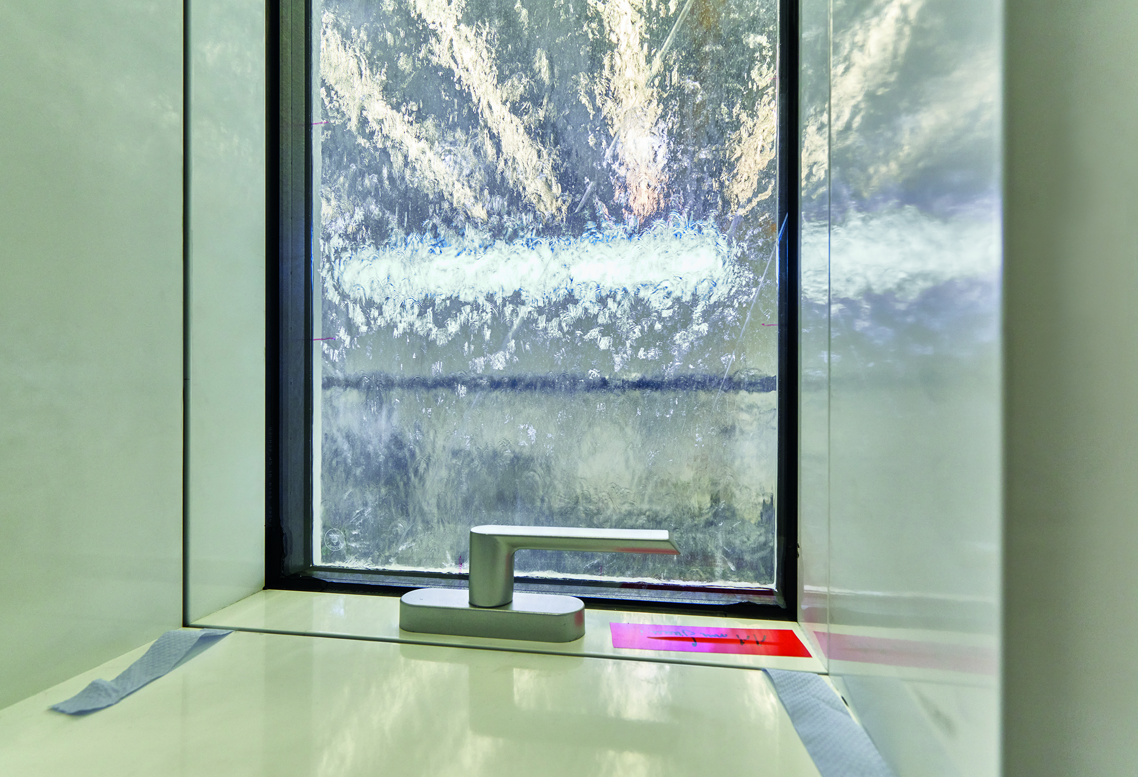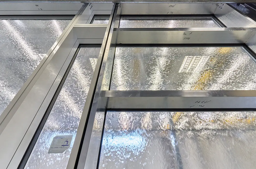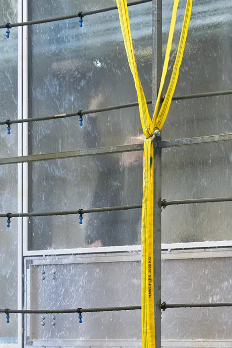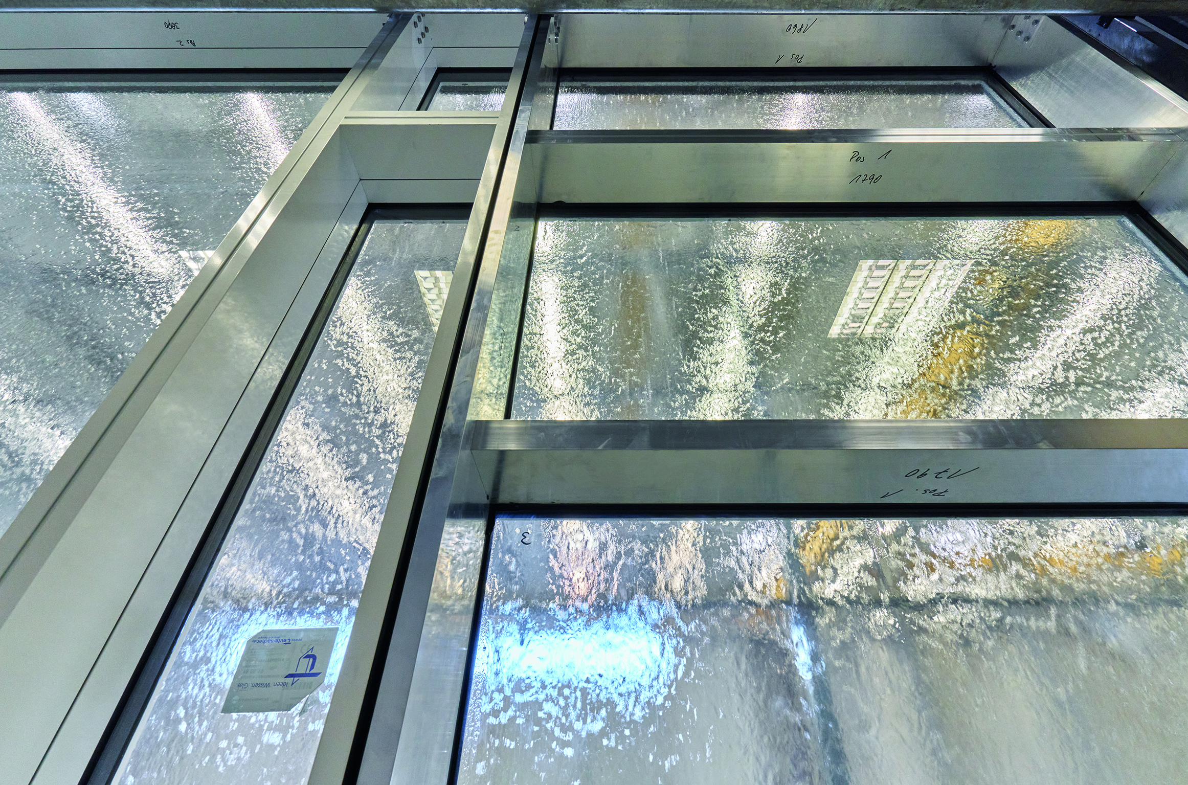 Die Schlagregendichtheit der Elementfassade wird mithilfe einer Besprühungsanlage geprüft, die entsprechend eines kräftigen Gewitterregens 3,4 l/min m2 auf die Fassade gibt. Dabei wird die höchste Klasse RE bei der Prüfung auf statischen Schlagregendichtheit erreicht.