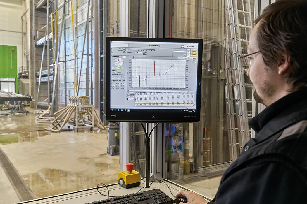 Mithilfe einer Software werden Kräfte wie Wind- und Wasserlasten, die während der Prüfung auf die Elementfassade einwirken, und die Messergebnisse erfasst und kontrolliert.