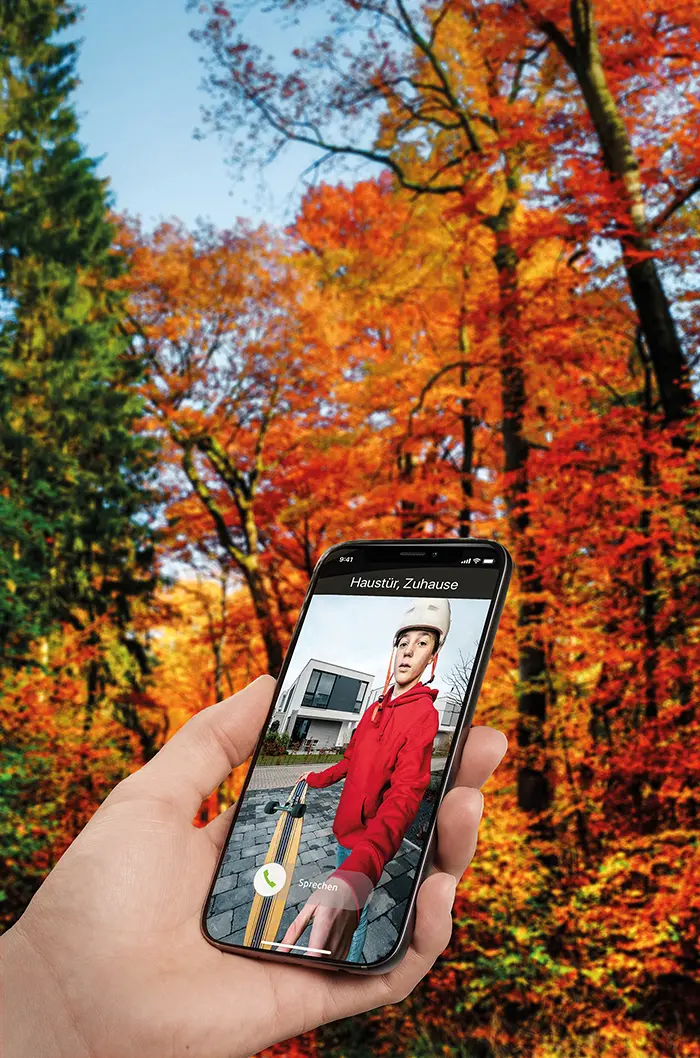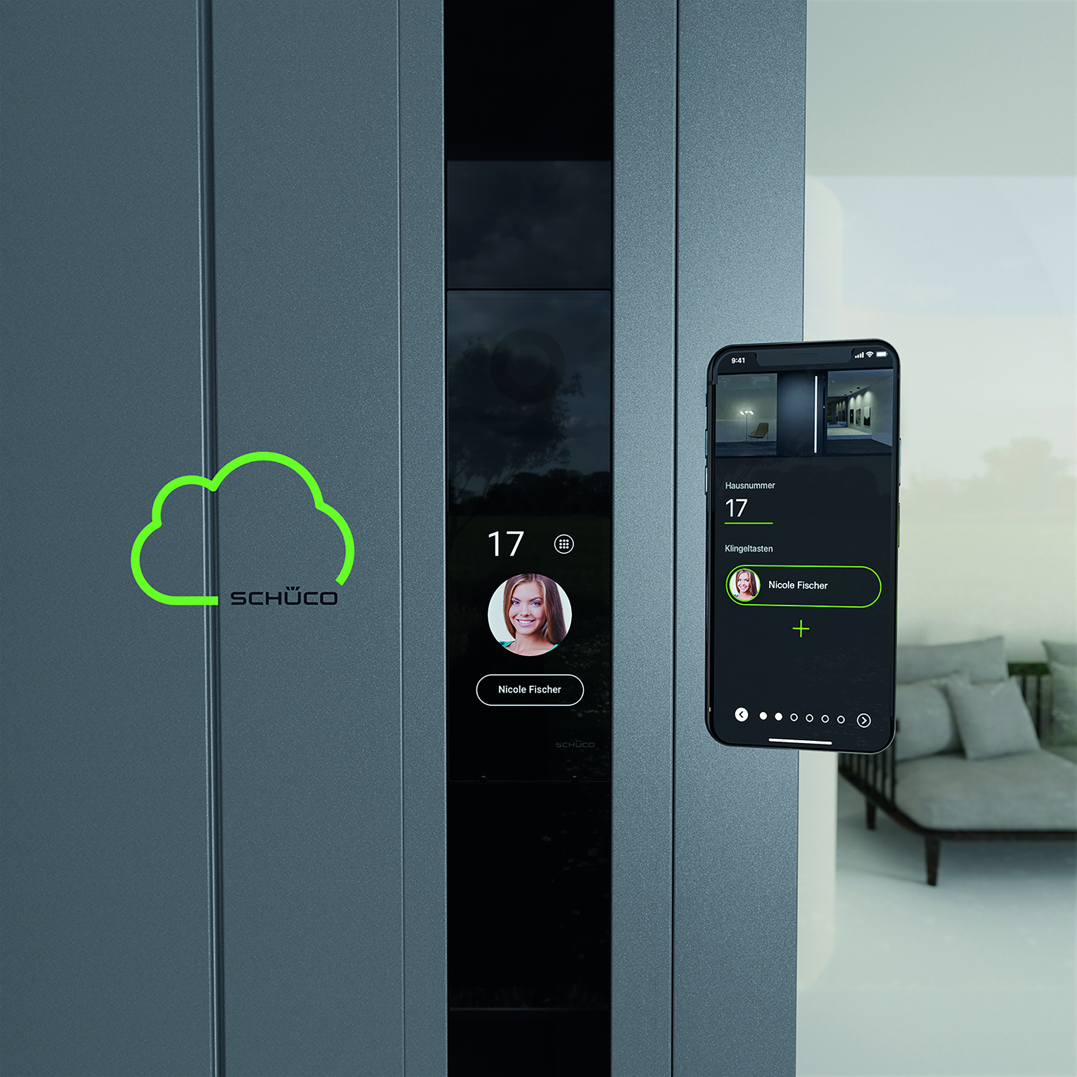 Via Schüco App lässt sich auch unterwegs die Tür öffnen und mit einer Person vor der Tür kommunizieren.