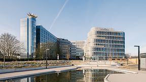 Die Unternehmenszentrale Schüco One wurde mit den drei Nachhaltigkeitslabels LEED, BREEAM und DGNB zertifiziert und verkörpert damit den Nachhaltigkeitsanspruch von Schüco.
