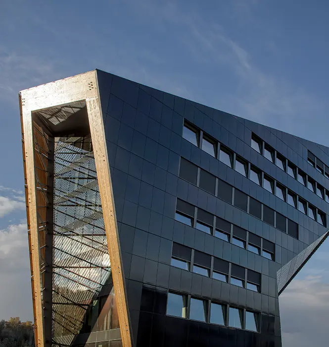 Bei der Gebäudeeingangsseite, die eine markante Kerbe ziert, bewies das Schüco Fassadensystem FWS 50 SG.SI größtmögliche Gestaltungsfreiheit bei gleichzeitig bestmöglicher Umweltverträglichkeit.