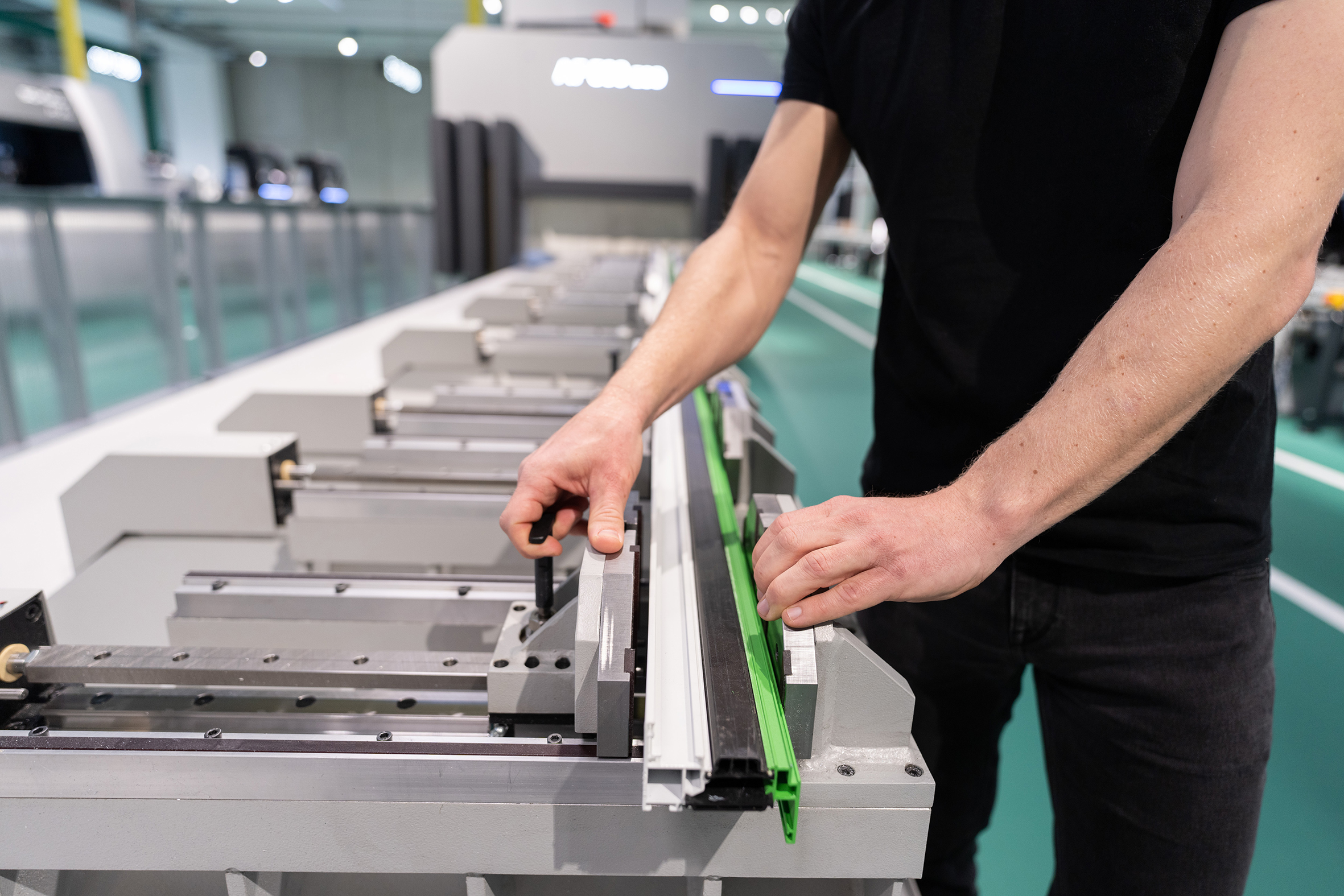 Die Fünf-Achsen-CNC-Maschine Schüco AF 500 ECO vereint die Produktionsschritte Zuschnitt und Bearbeitung mit einem innovativen ökologischen Konzept.