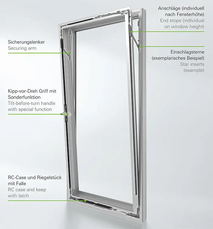Zertifizierte Sicherheit: Die neue Beschlagkonfiguration mit fünf Sicherungskomponenten bietet auch in gekippter Position des Fensters Einbruchhemmung bis Widerstandklasse 2 (RC 2).