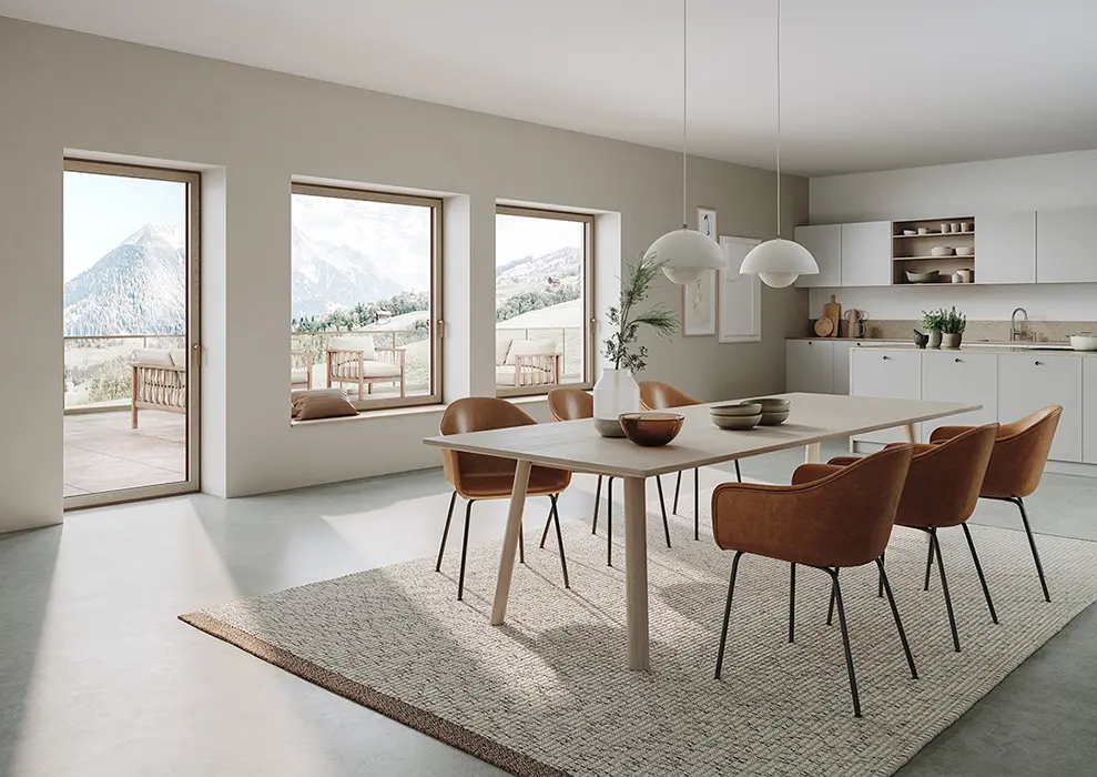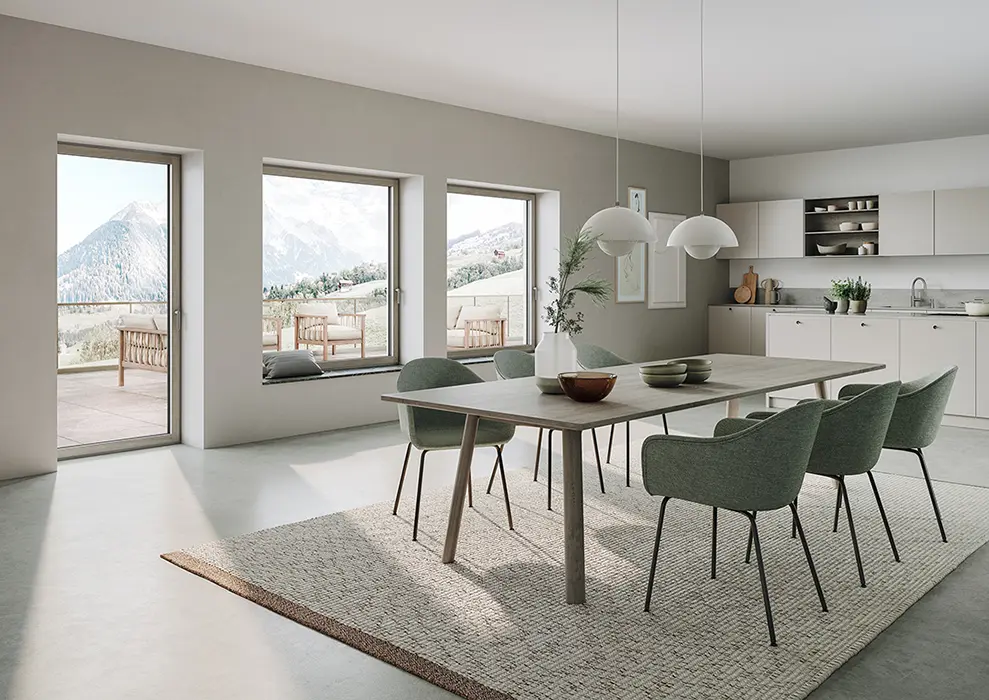 Außen Aluminium, innen Holz: Mit Schüco AWS WoodDesign können Aluminiumfenster im Innenbereich in Holz-Optik gestaltet werden (Eichenholzvariante im Bild: Gris Beige).