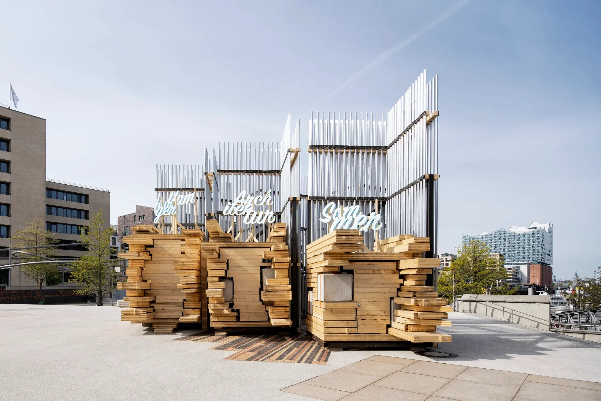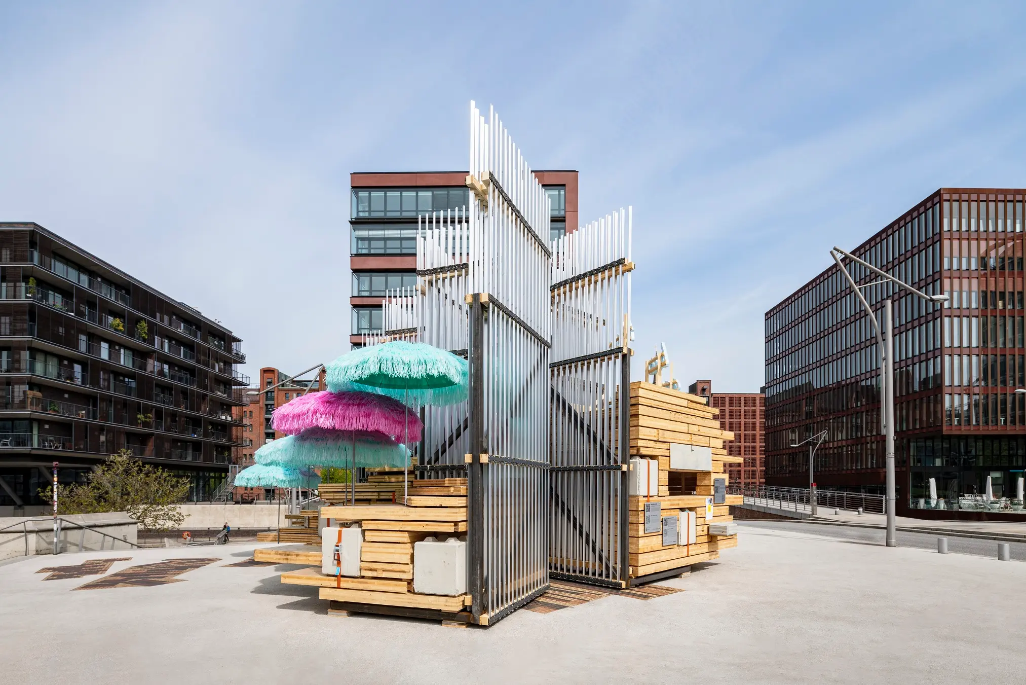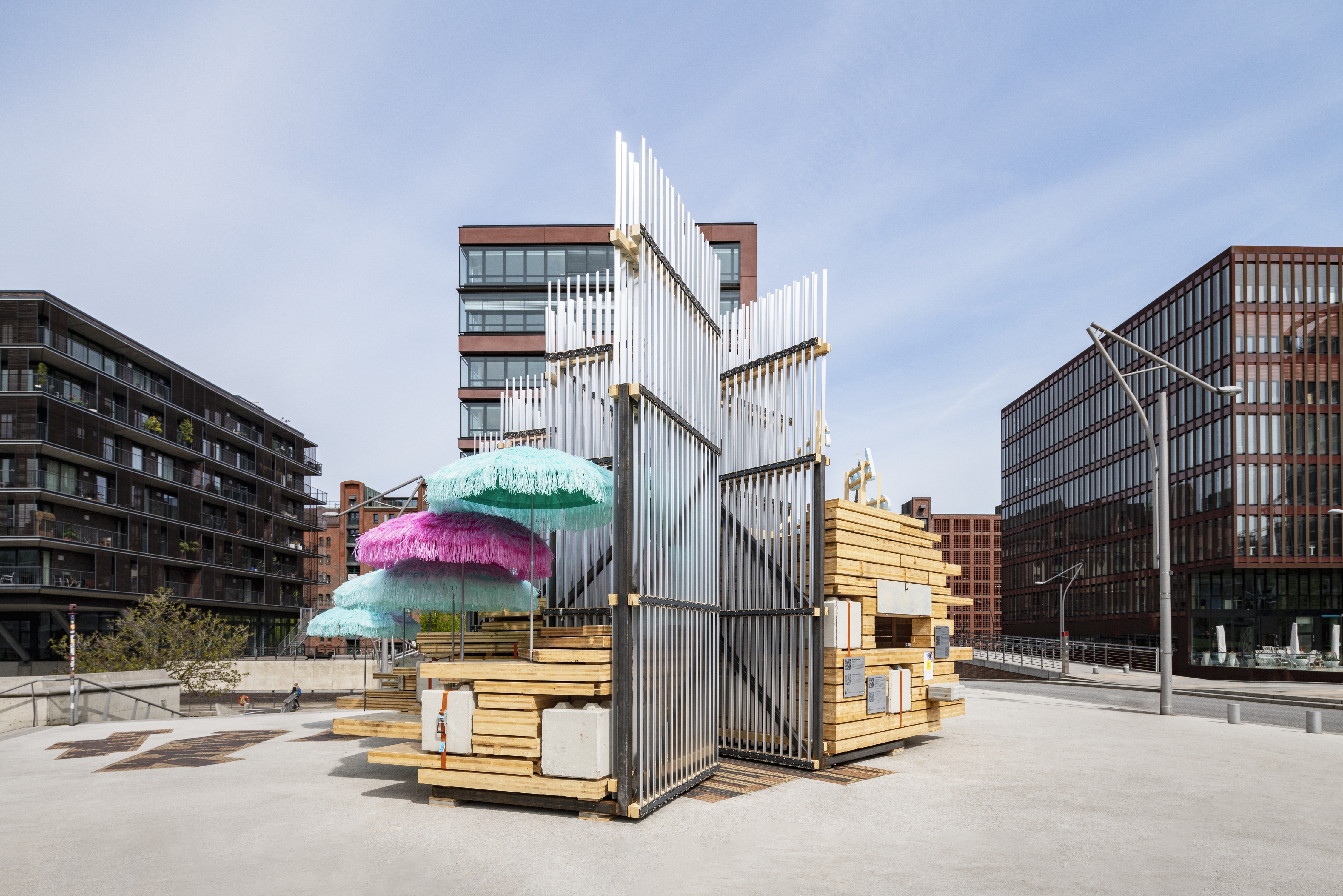 Info-Pavillon des Hamburger Architektur Sommers 2023 lädt zum Verweilen und Staunen ein und bietet von der Sitzgelegenheit bis zur Bühne zahlreiche Nutzungsmöglichkeiten.