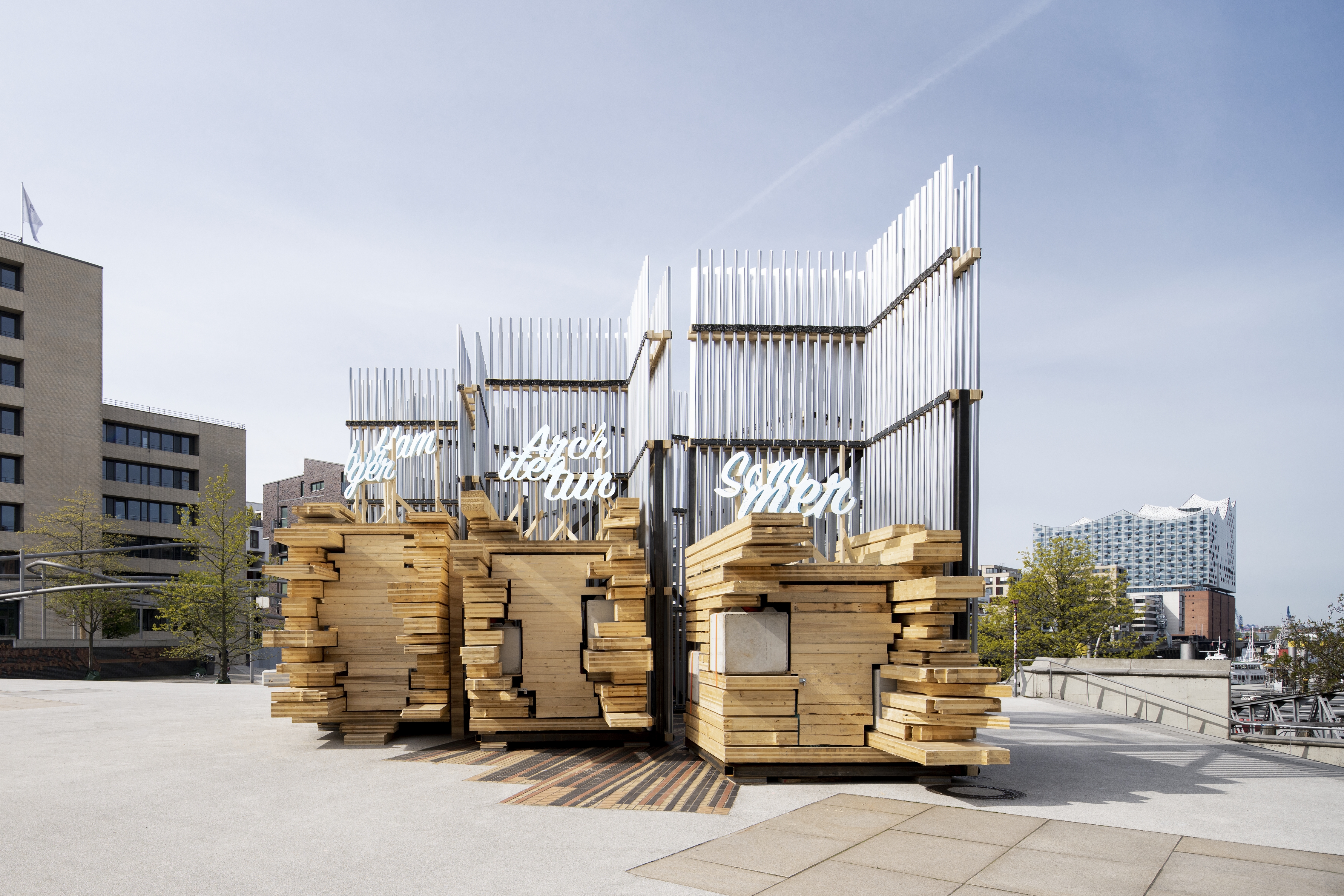 Bielefeld/Hamburg. „Zwischen Ökologie und Baukunst“ lautet das Thema des 10. Hamburger Architektur Sommers, der von Anfang Mai bis Ende Juli mit mehr als 270 Veranstaltungen an etwa 150 Orten in ganz Hamburg ein Festival der Architektur und Baukultur begeht. Auf den Magellan-Terrassen, in unmittelbarer Nähe zur Elbphilharmonie, ist dafür ein Info-Pavillon aus Aluminium und Holz als temporäre Installation entstanden. Unterstützt wurde das Projekt des Künstlerkollektivs umschichten von den Unternehmen Schüco und Derix. Das Besondere: Alle Bestandteile der Installation werden weiterverwendet. Als physisch erlebbares Zeichen adressiert der Pavillon damit das Thema Zirkularität im Bauwesen.