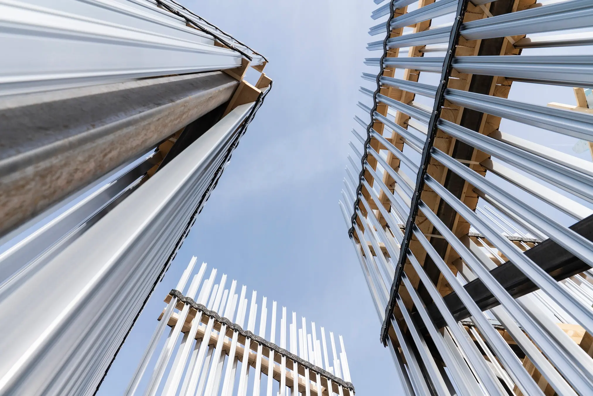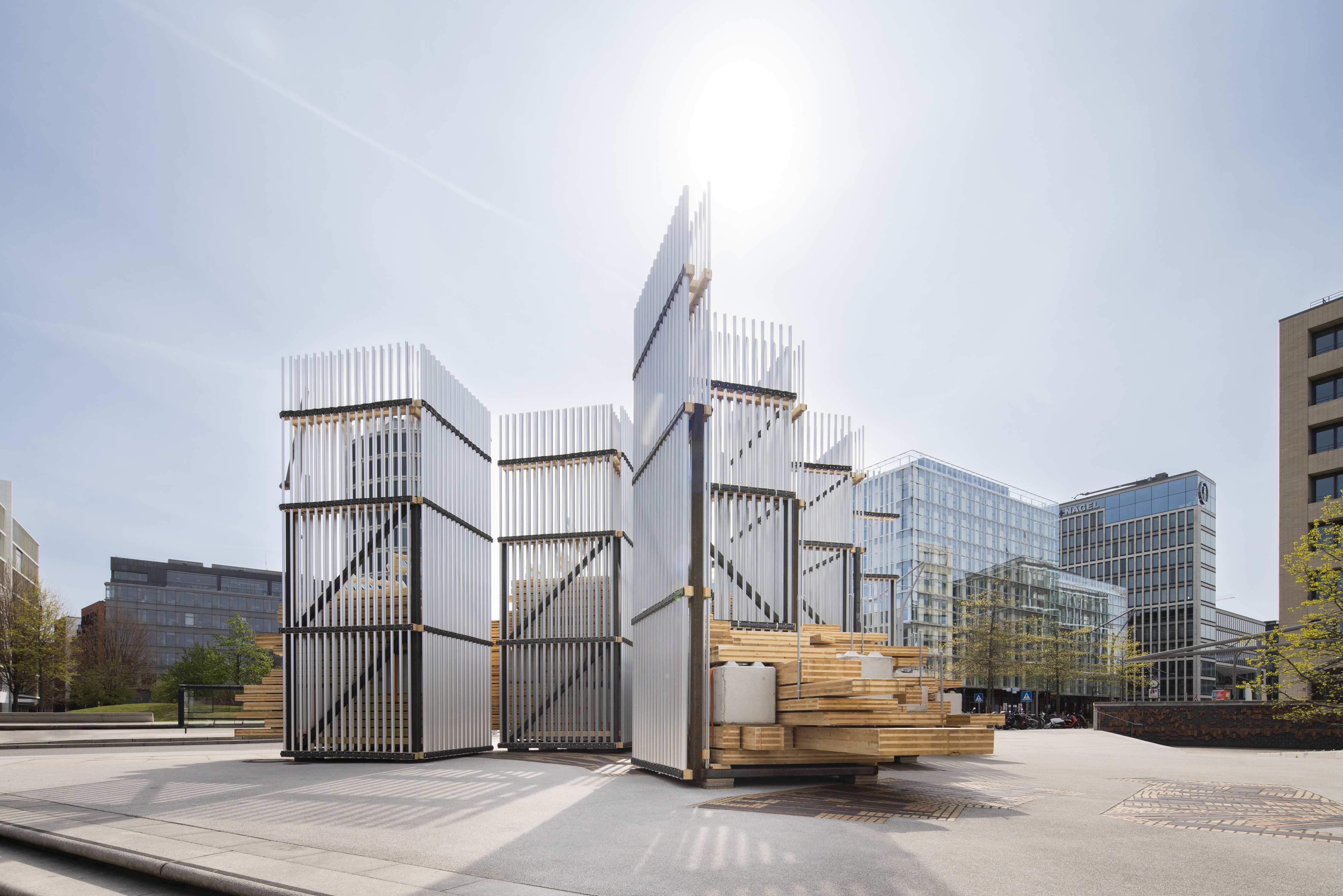 500 sechs Meter lange Aluminiumprofile von Schüco und ca. 20 Tonnen Ausschnitte aus Brettsperrholzwandelemente von Derix hat das Künstlerkollektiv umschichten in ein Architekturkunstwerk verwandelt.