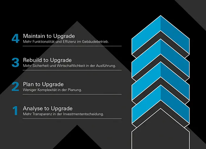 Schüco Value Up ist ein in vier Phasen strukturiertes modulares Angebot von Produkten und Services für einen wertsteigernden Sanierungsprozess.
