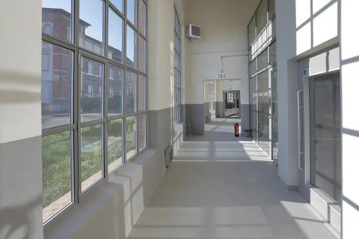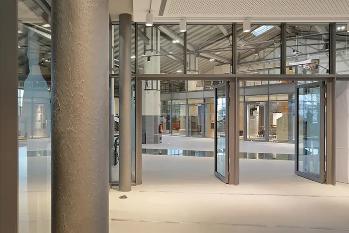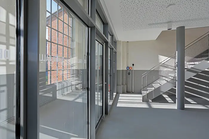 Der thermische Raumabschluss besteht aus Janisol Produkten von Schüco Stahlsysteme Jansen. Die großformatigen Stahl-Glaselemente sind dem historischen Vorbild nachempfunden – teilweise innen vorgesetzt – und im originalen Farbton, einem neutralen Grau, beschichtet.