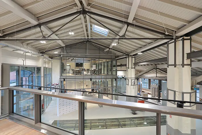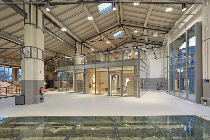 Zwei verglaste Kuben im Inneren des Lokschuppen bieten Möglichkeiten für Events und Workshops: der östliche zweigeschossig mit einer Grundfläche von ca. 65 Quadratmetern, der westliche eingeschossig mit begehbarer „Dachterrasse“.