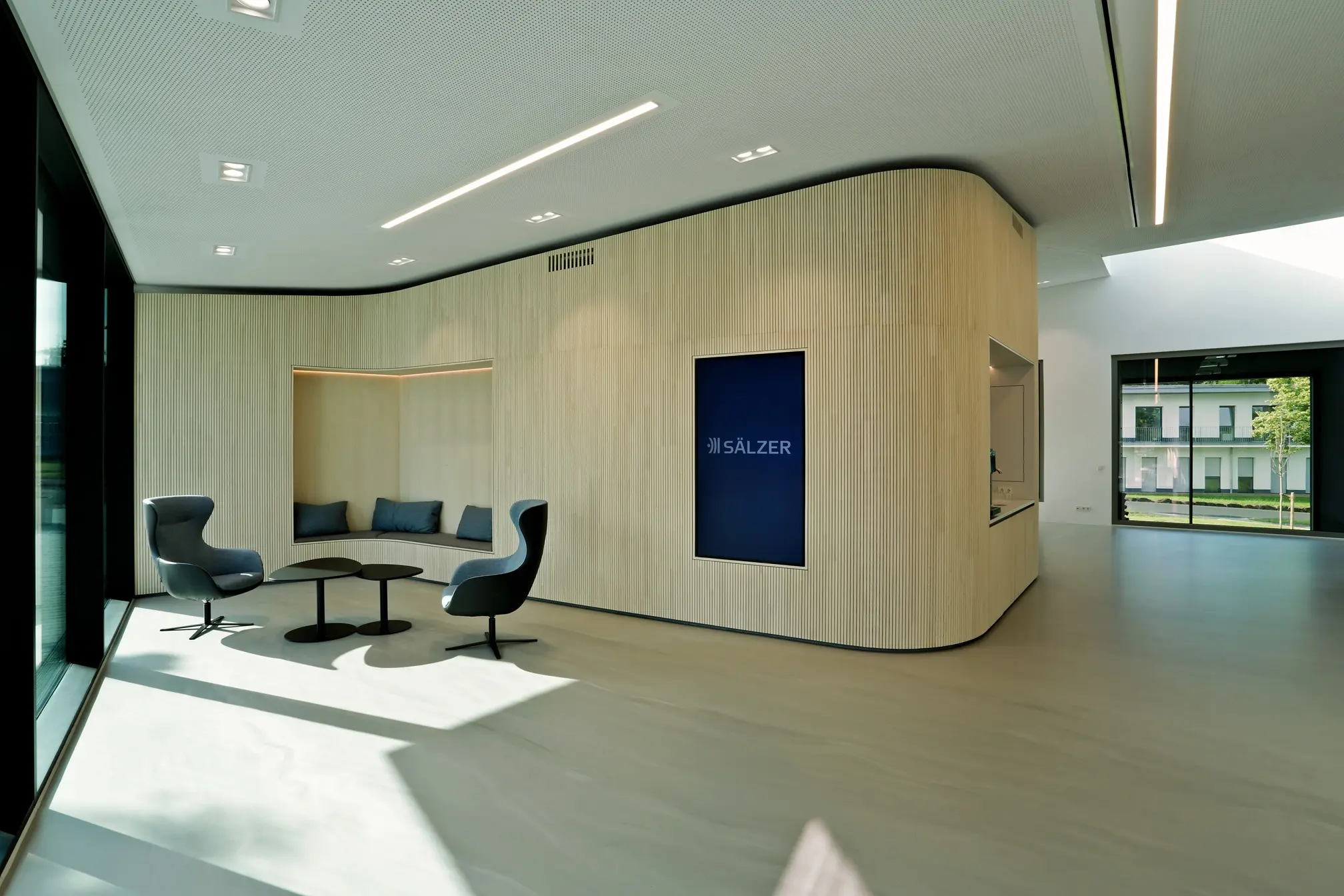 Hinter der geschwungenen, mit Holzpaneelen verkleideten Wand im Besucherfoyer verbergen sich das Stuhllager und eine Teeküche. Die hierdurch entstehende Zonierung des Foyers schafft gute Möglichkeiten einer Parallelnutzung.