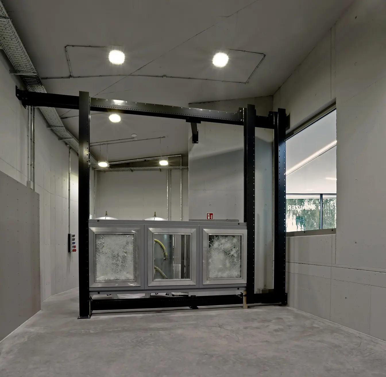 Während einer Druckprüfung wird über ein Schiebefenster der Raum nach außen hin geöffnet, sodass durch in die Fassade integrierte Druckentlastungsöffnungen der im Raum entstehende Überdruck schnell entweichen kann.